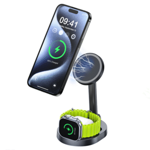 3n1 MagWIRELESS, your ultimate charging solution designed for the modern tech user. This innovative MagSafe wireless charger allows you to charge your iPhone, AirPods, and Apple Watch simultaneously, streamlining your daily routine. With a powerful output of up to 15W, this charger ensures rapid and efficient charging for all your devices. Featuring a sleek design with a Type-C input (9V/3A), the 3n1 MagWIRELESS is compact and portable, making it perfect for home, office, or travel use. Say goodbye to cluttered cables and hello to convenience with this essential gadget!