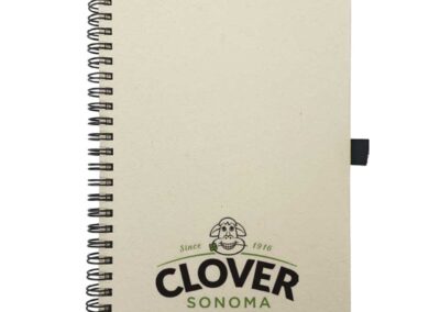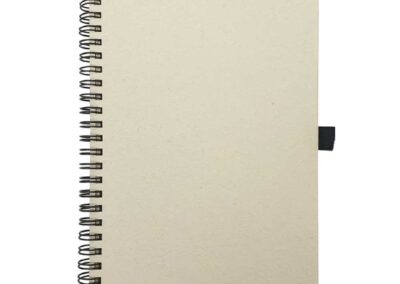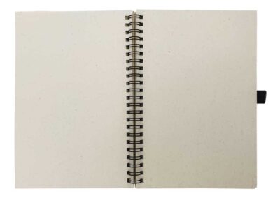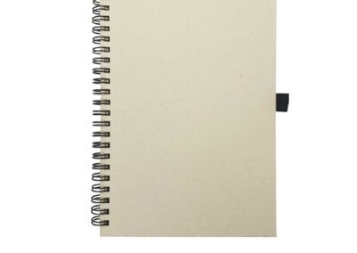 A5 spiral notebooks with a pen loop and information details inside the front cover, constructed from recycled milk carton material with a 120g hardcover and 70 sheets of 80g inner plain pages. A green product, our personalized Milk Carton A5 Size Spiral Notebook.