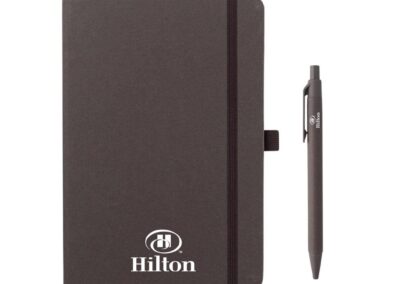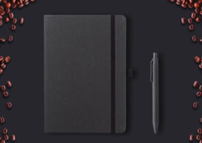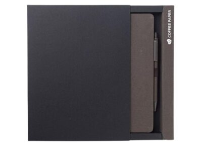 Set of A5 Fruit Paper Hardcover Notepad and Pen in Gift Box. Both notepad cover and pen barrel contains sustainable fruit papers that are created from the residues of agri-food industry (such as kiwi orchards). Notepad includes 160 pages of 70g ruled pages. Pen is a ball pen with matching fruit paper barrel. Presented in a sliding gift box.