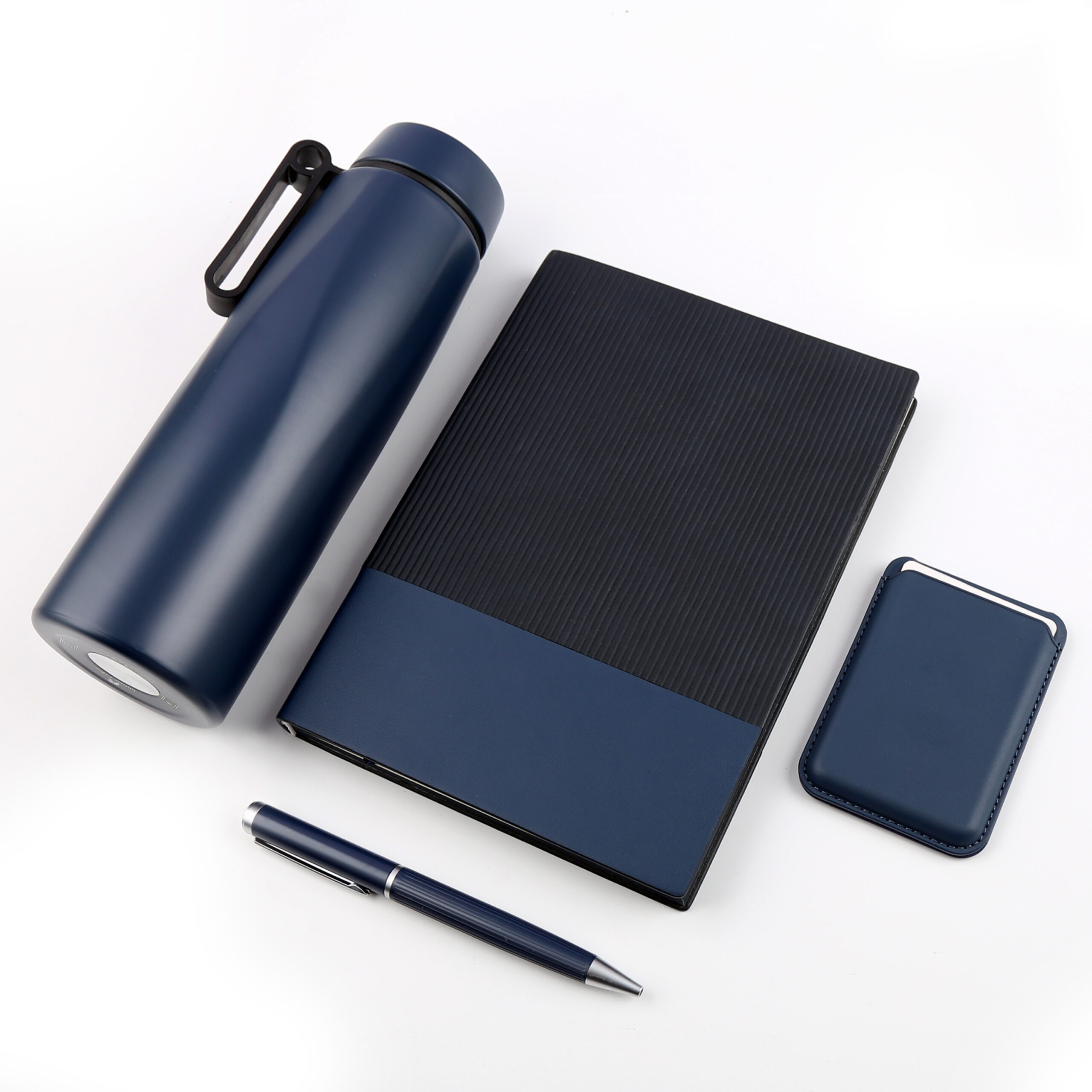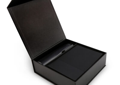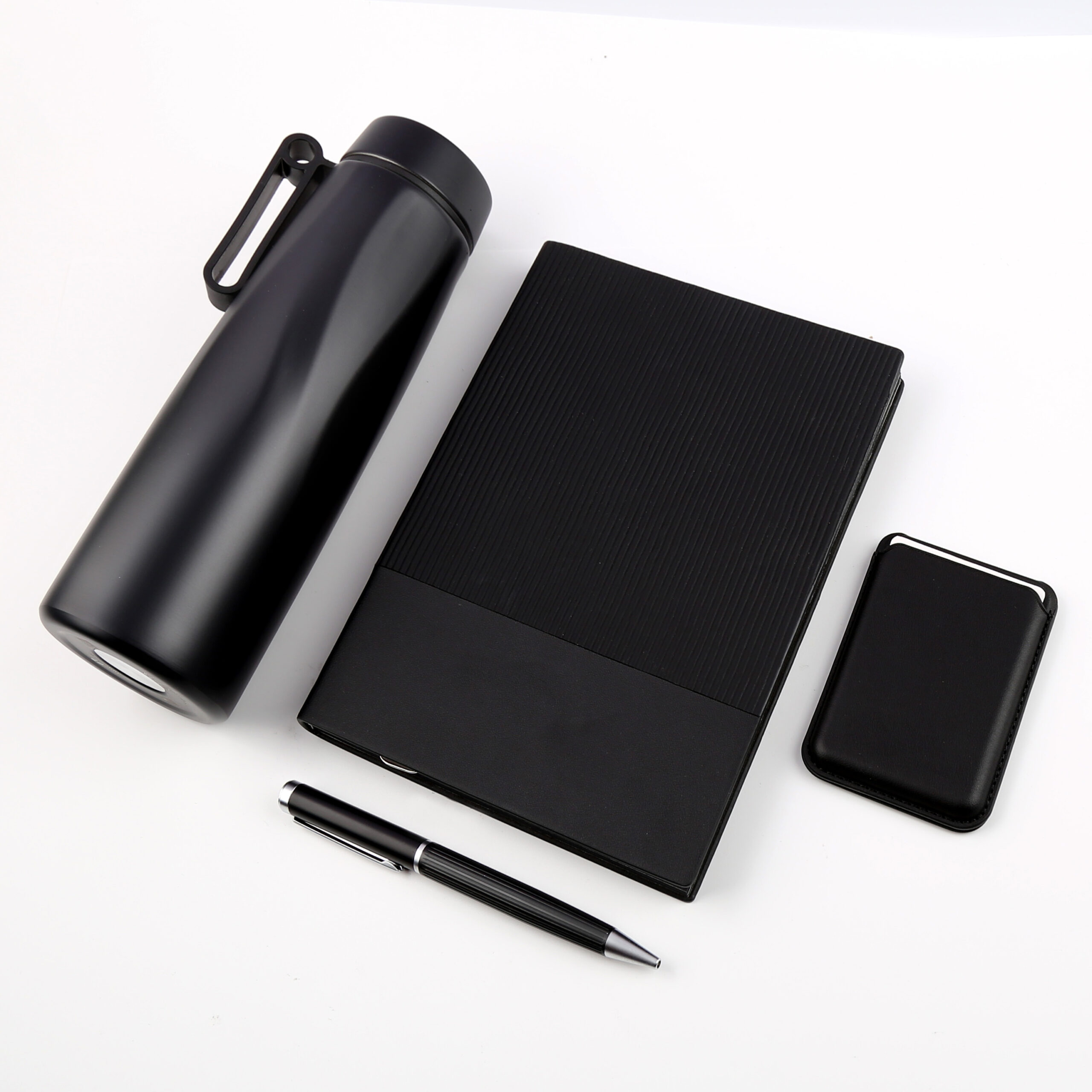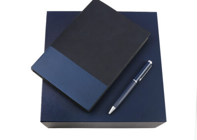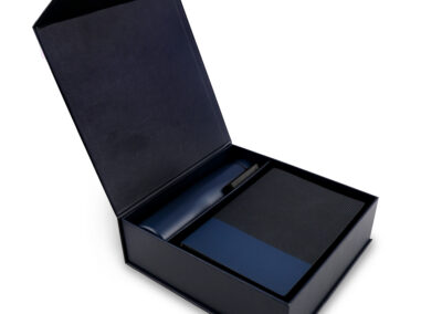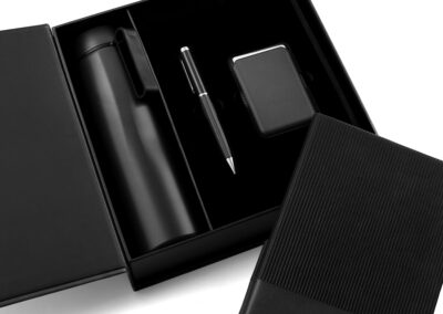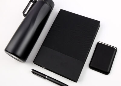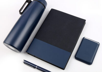 Welcome set is best for company give aways as it comprises the most basic requirement of a gift set: PU notebook with 120sheets, metal pen, RFID card holder and 500ml calypso flask. Product Size: 25.2×24.2×7.6cm. Packaging:c