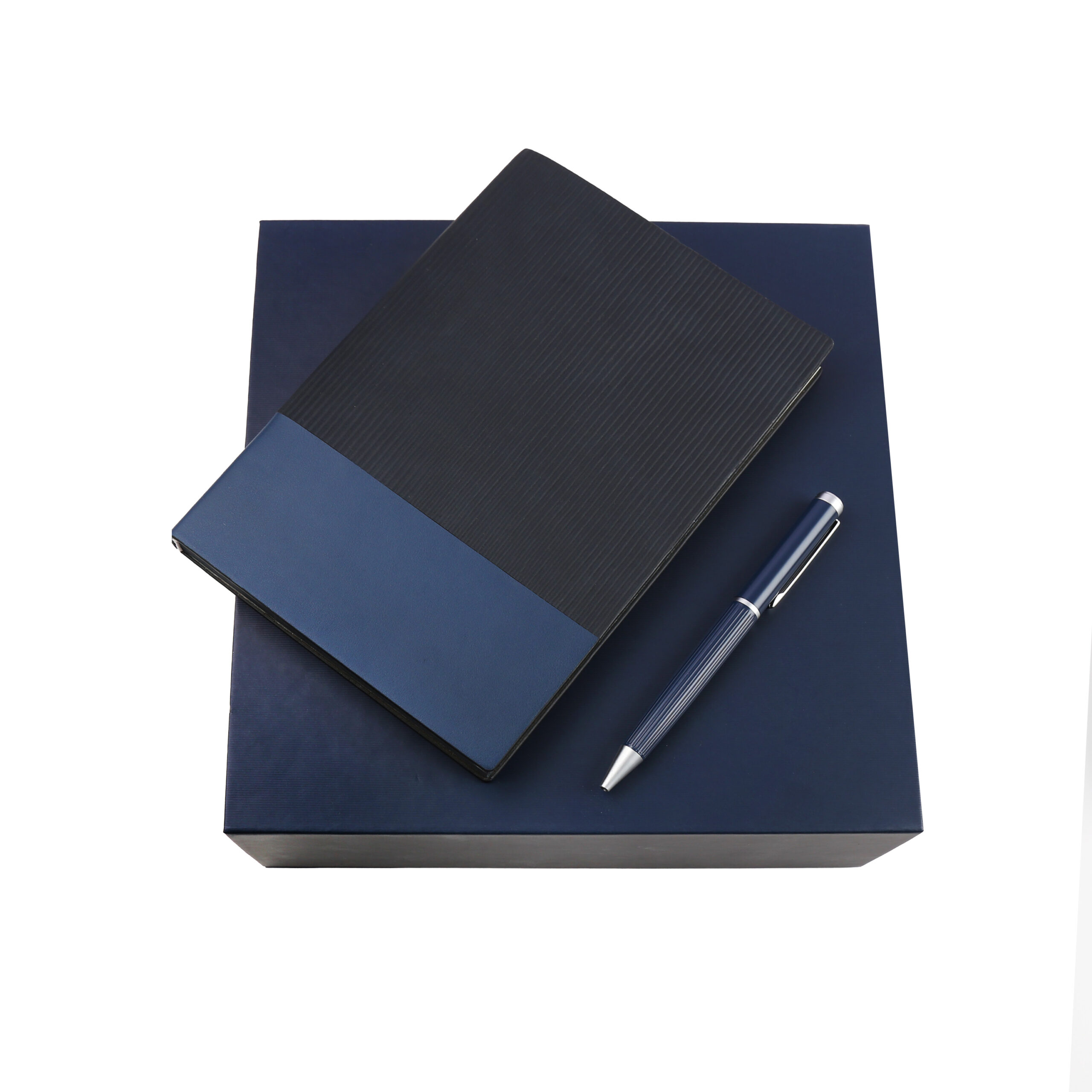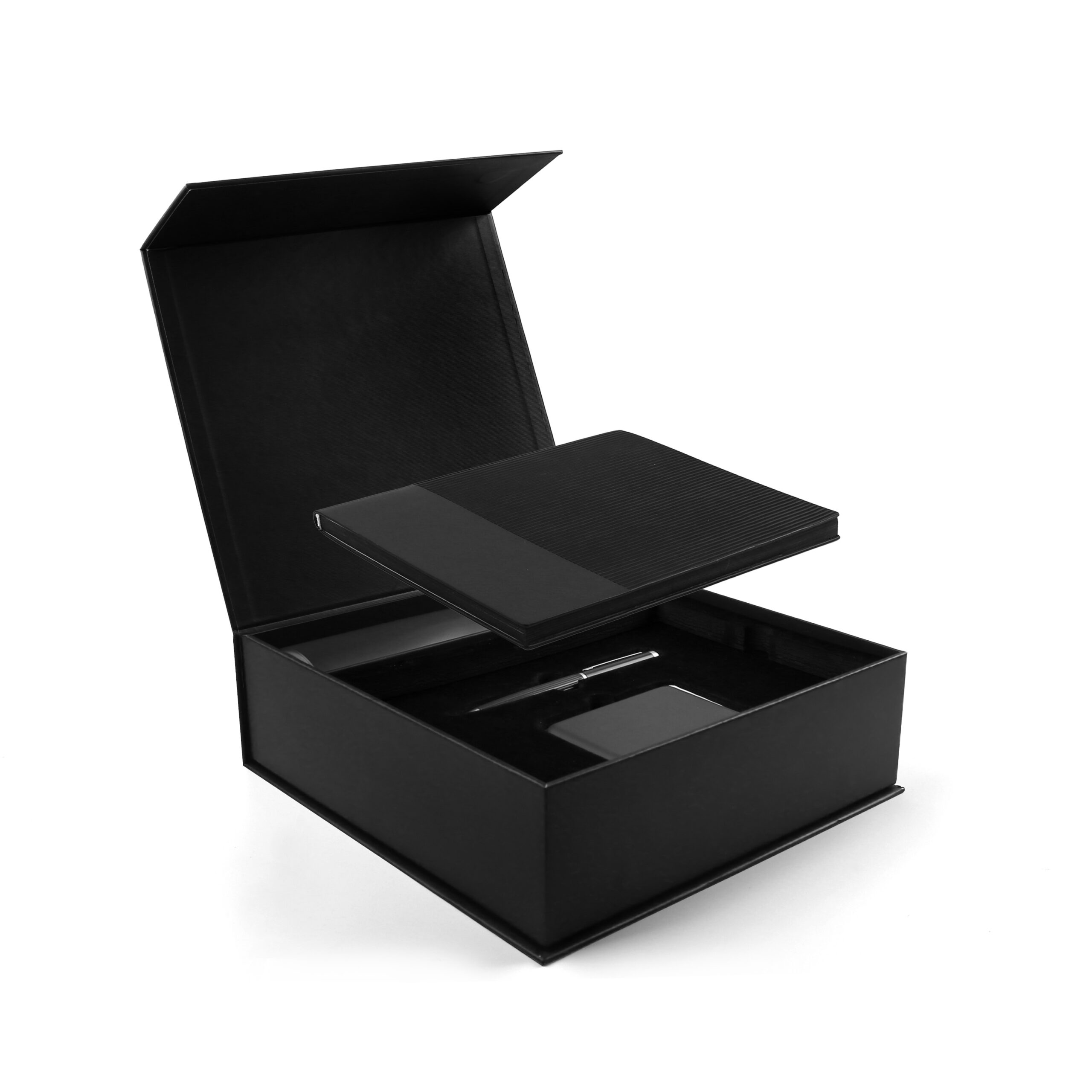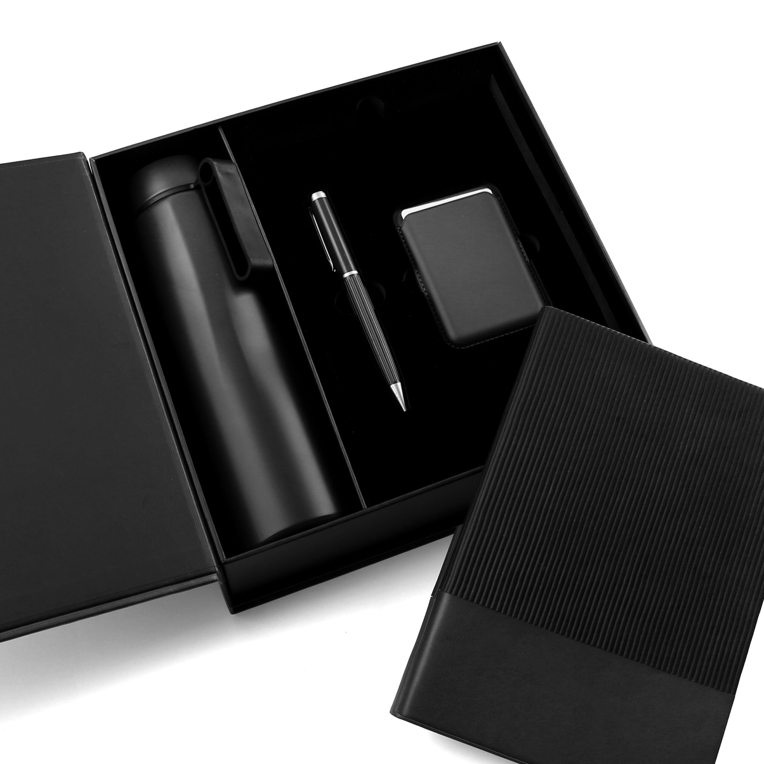 Welcome set is best for company give aways as it comprises the most basic requirement of a gift set: PU notebook with 120sheets, metal pen, RFID card holder and 500ml calypso flask. Product Size: 25.2×24.2×7.6cm. Packaging:c