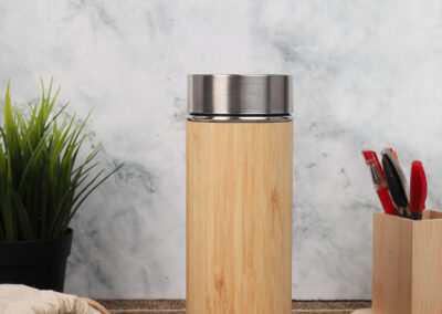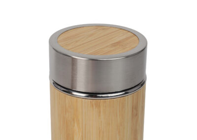 Vacuum stainless steel flask that is wrapped with bamboo exterior. Comes with a bamboo wrapped lid and a tea infuser.