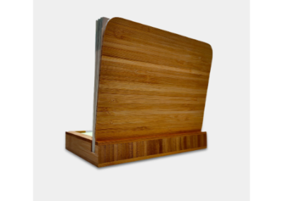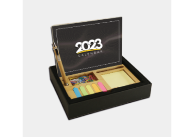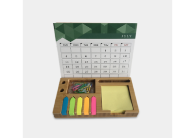 A Bamboo desktop organizer with 350GSM art paper printed calendar and bamboo mouse pad. Has 100 sheets of yellow sticky note, 150 sheets arrow-shaped sticky notes in 5 different colors, 40pcs clips and a ballpen. Packed in a black special paper cardboard with PVC lid. Desktop Size: 21*12.9*2.9cm ; Calendar Size: 20.8×16.6cm Mousepad Size: 20.8×16.6cm. Packaging Size: 19.9×24.1×4.4cm Packaging: Black Sleeved Box