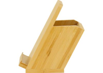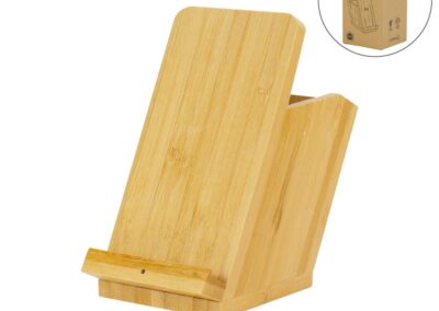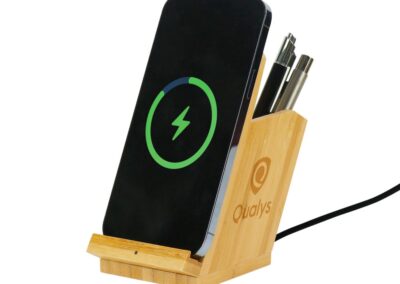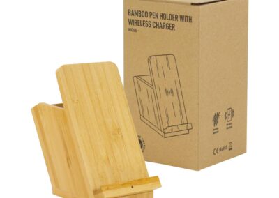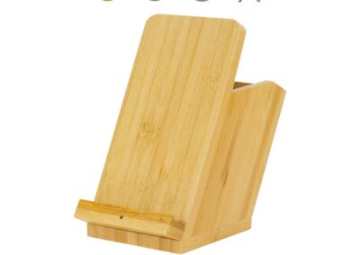 A Bamboo Pen Holder with a built-in 15W Wireless Charger combines functionality and aesthetic appeal.