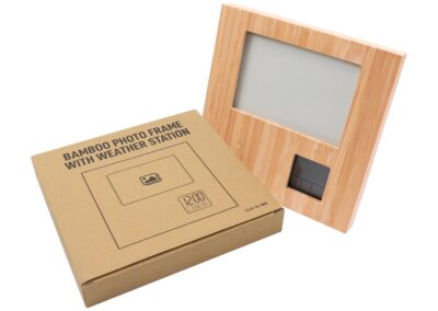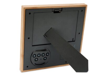 Eco-Friendly Bamboo Photo Frame with Digital Clock and Weather Station, Display Time, Date, Temperature, and Alarm Function. Nature line photo frame made in polished bamboo, with an integrated weather station and functions thermometer, hygrometer, and clock. Suitable for 9x14cm photos and with battery-operated clock (button cells included).
