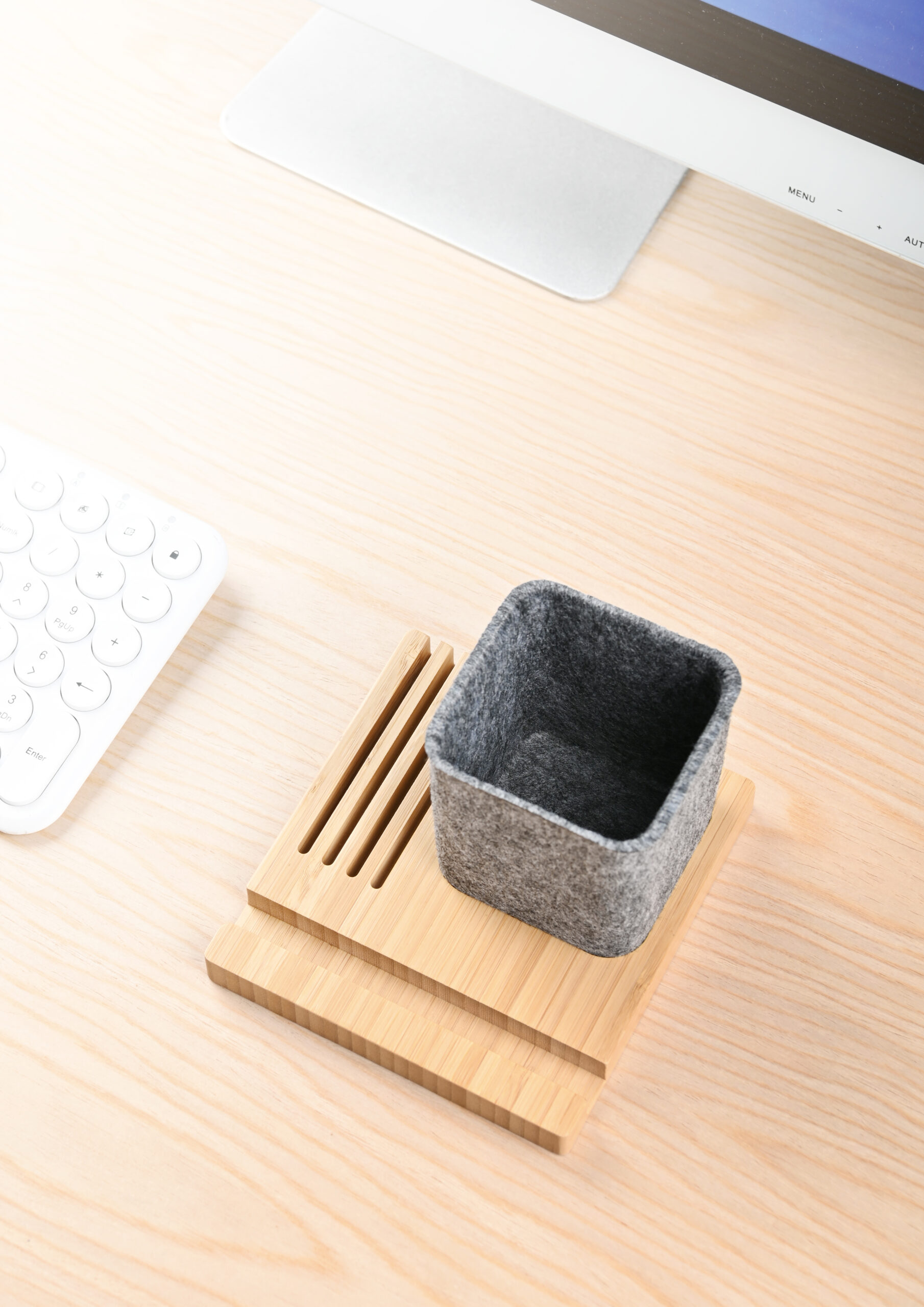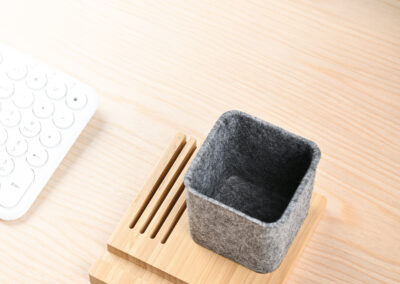 Pen box holder with card holders and phone stand Recycled Felt+Bamboo-RCS material. Product Size: 13.9x13x9.5cm. Packaging: Kraft Paper Box