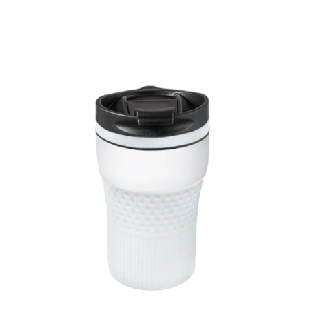BAYAMO THERMO MUG White, a premium thermal mug designed for those who value quality and style. With a capacity of 230ml, this sleek mug is crafted from high-quality matte stainless steel, featuring an anti-fingerprint paint finish that keeps it looking pristine.The double wall construction ensures that your hot beverages stay hot and cold drinks remain chilled for 4-6 hours, making it perfect for office use, home, or travel. Its leak-proof design means you can carry it confidently in your bag without worrying about spills. The silicone grip and ring can be customized in your desired colors, allowing you to express your personal style or brand identity.With dimensions of 92 mm (diameter) x 143 mm (height), the BAYAMO THERMO MUG is both functional and fashionable, packaged elegantly in a white paper box, making it an ideal gift for any occasion.