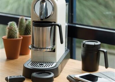 With 8 cm height, Bevage by XDDesign is the perfect double wall mug for your coffee machine. Fits most coffee machines. PP inner. Great for your Espressos and Cappucinos. Nice handle for 1 hand drinking. Easy twist spill proof lid. Hand washable only.