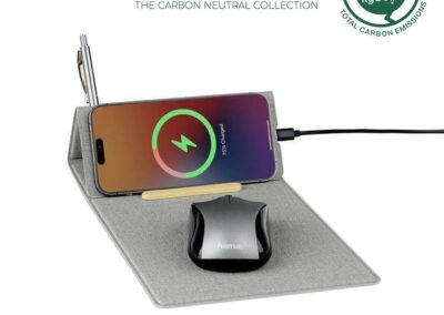 Memorii® Folding Wireless Mousepad & Desk Organizer is an elegant and compact desk accessory made from RCS-certified recycled PU. It includes a 15W wireless charger and phone stand with a bamboo stopper, mousepad and pen stand. Folds flat and can be easily carried on the go. Blace is a CHANGE ZERO product, which means that it is developed with a net zero carbon footprint – By using RCS-certified recycled PU materials, we reduce 14% carbon emissions from material use (verified by ecoact®). Further, we offset the balance 1.08 kgCO2eq per unit by financing renewal energy projects through Climate Partner, making it a carbon-zero product. Packed in an elegant gift box.