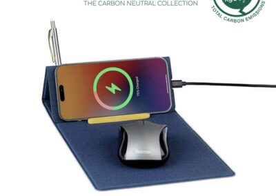 Memorii® Folding Wireless Mousepad & Desk Organizer is an elegant and compact desk accessory made from RCS-certified recycled PU. It includes a 15W wireless charger and phone stand with a bamboo stopper, mousepad and pen stand. Folds flat and can be easily carried on the go. Blace is a CHANGE ZERO product, which means that it is developed with a net zero carbon footprint – By using RCS-certified recycled PU materials, we reduce 14% carbon emissions from material use (verified by ecoact®). Further, we offset the balance 1.08 kgCO2eq per unit by financing renewal energy projects through Climate Partner, making it a carbon-zero product. Packed in an elegant gift box.