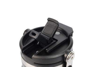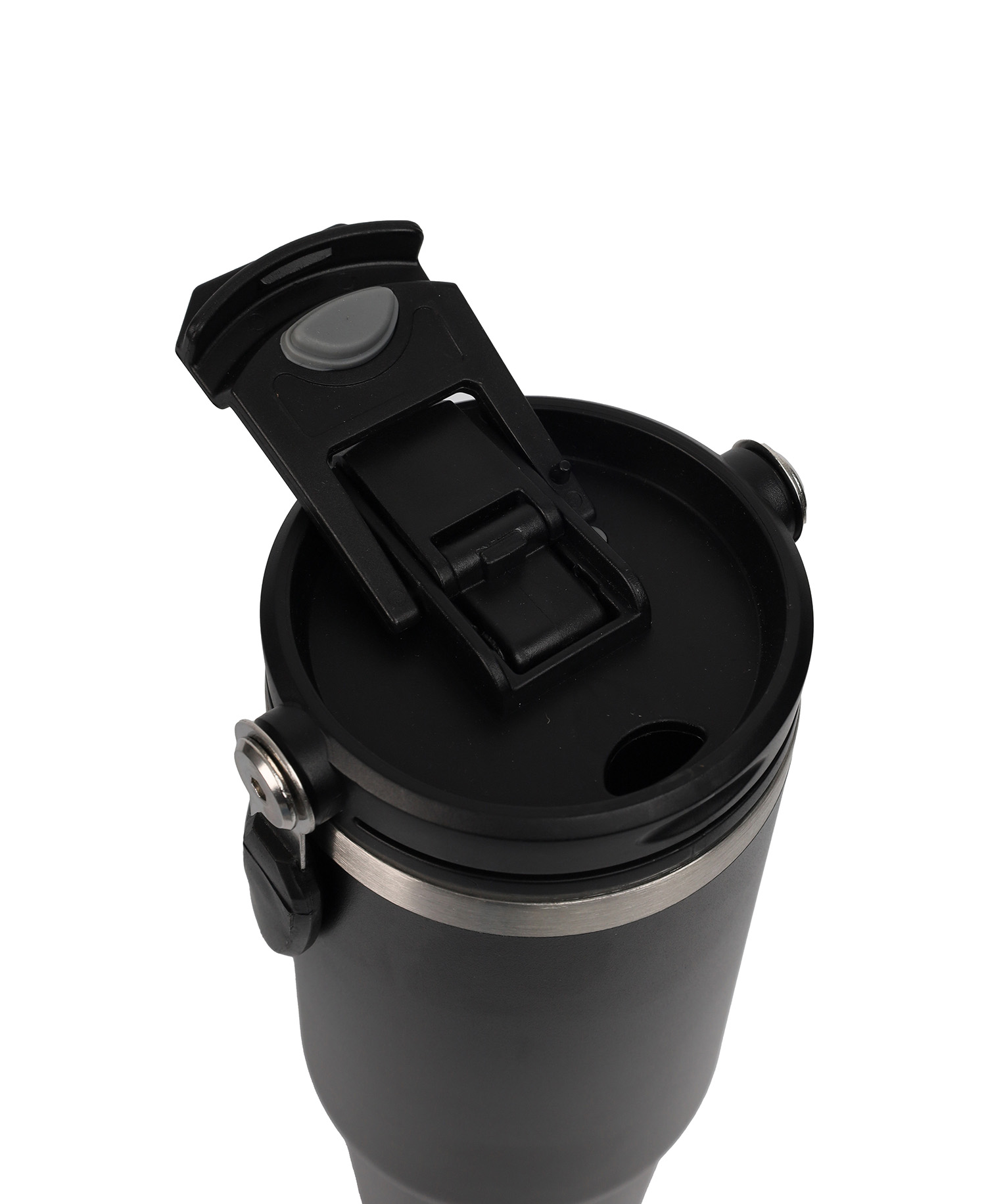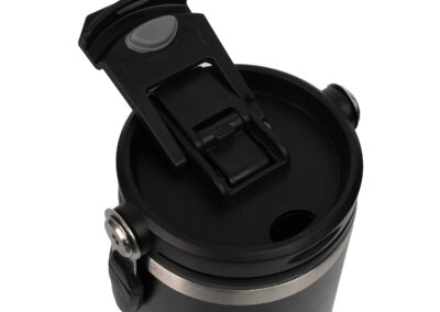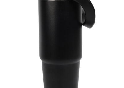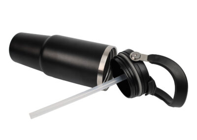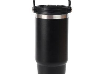 A double wall stainless steel tumbler that comes with a handle. It comes with a flip stray sipper and keeps drinks hot/cold for 8 hours