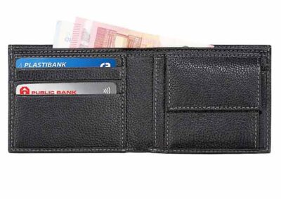 Genuine Leather Men’s wallet with contrast grey stitching. The inside of the wallet features 3 card slots, 2 section for banknotes and 1 coin pocket. This product contains Biomaster antimicrobial technology that provides protection against the growth of harmful micro-organisms for the lifetime of the product. A special tracker is built into the product to prove that the surface is treated with Biomaster. Packed in a Santhome gift box.