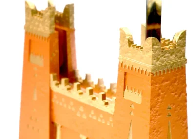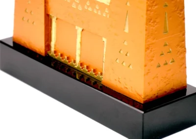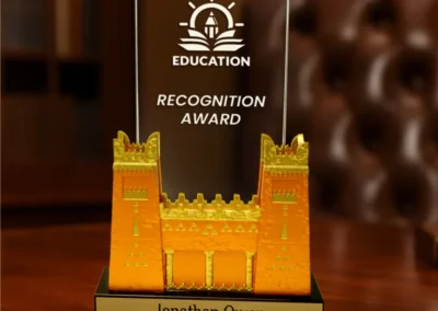 Material: Crystal Glass | Item Size: 198 × 65 x 320 mm | Item Weight: 3.288 kg, The Castle Design Crystal Award features a stunning 15mm thick clear crystal top, elegantly mounted over a gold and yellow castle-themed base. This premium award is beautifully presented in a sleek black fiberboard box, making it ideal for recognition ceremonies, corporate milestones, or appreciation events.