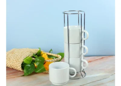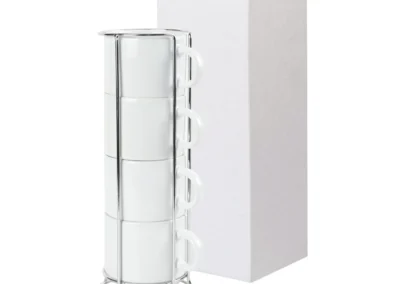 The set comes complete with a sleek silver metal rack, designed to hold all four cups in an organized and accessible manner. The vertical rack saves valuable counter space and keeps your cups neatly arranged, making it easy to grab a cup whenever you need one.