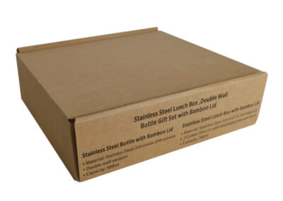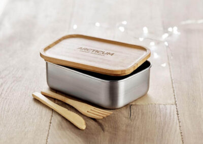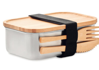[LUNCH BOX] Stainless Steel lunchbox with bamboo lid, bamboo fork and bamboo knife. Detachable band keeps all items together. Capacity 700ml. Bamboo gives luxury feel with natural variations in colors and size in each piece. Material – SS 304. Food Grade