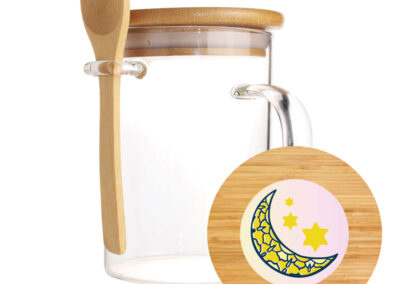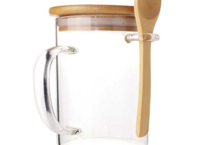 Material: Glass & Bamboo | Capacity: 400 ml | Size : 120 x 100 x 117 mm | Item Weight: 0.305 kg, Clear glass mugs with a bamboo spoon and lid are fashionable mugs made of an inventive and environmentally sustainable combination of glass and bamboo. This promotional travel mug is constructed of sturdy glass, while the spoon and lid are made of sustainable bamboo. These mugs’ bamboo lids keep your coffee or tea warm and away from a chilly environment. Although you may also use these premium mugs in the summer, they are great for the winter.