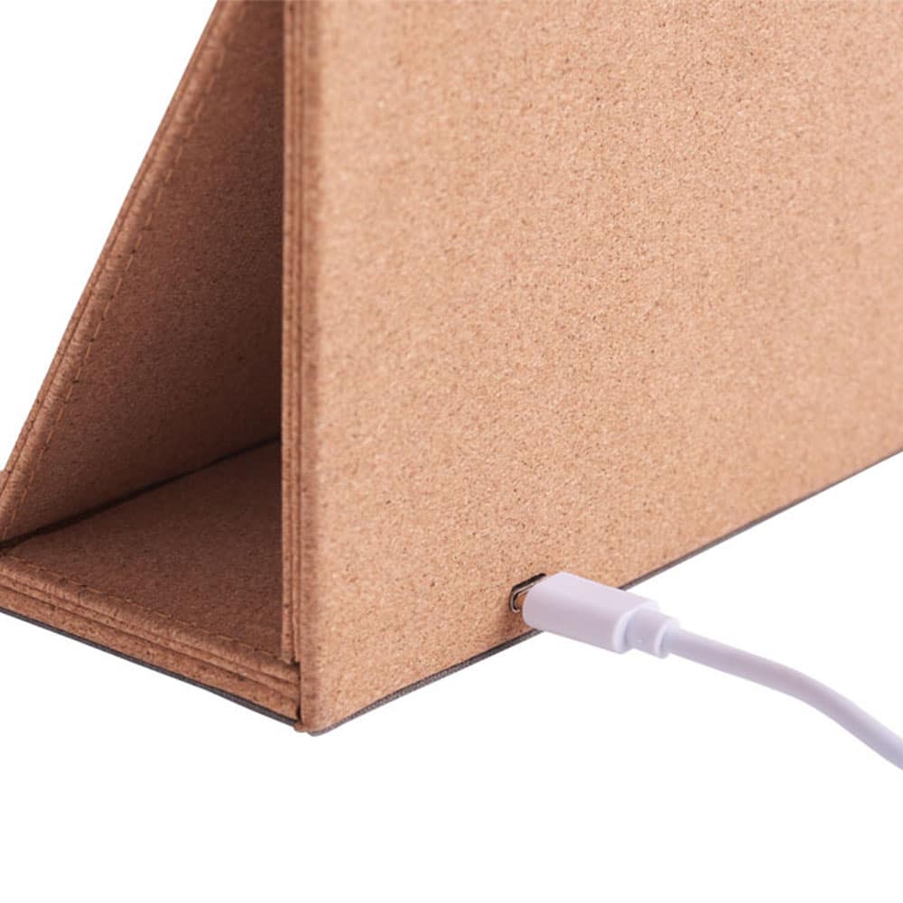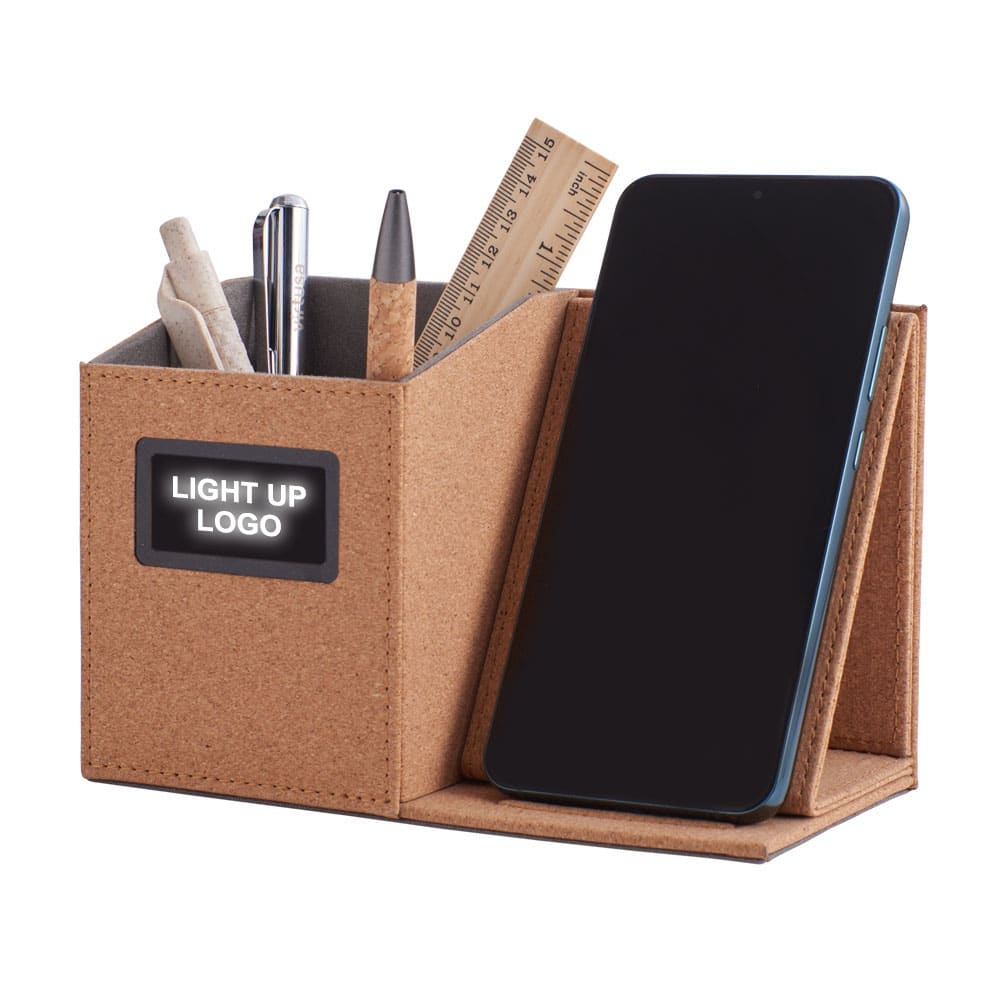 A multifunctional desk accessory that seamlessly combines eco-conscious design with modern technology. Craed from sustainable cork, this stylish pen holder features a wireless charging pad on the top surface, making it a versatile addition to your workspace. Plus, it includes a unique light-up logo feature, adding a touch of personalization and flair to your desk.