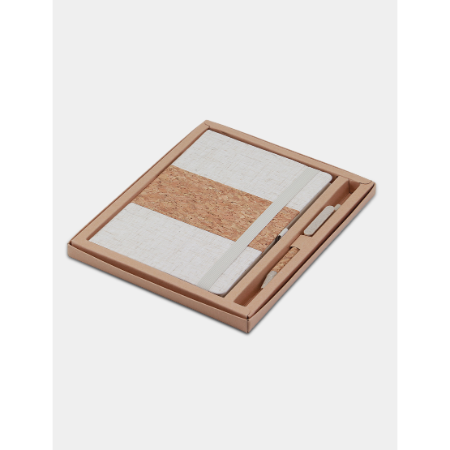 Nice and sleek design for a sustainable set that consist of A5 notebook in cork & linen cover with 96 sheets 70g ruled ivory paper & pen loop and cork ballpen packed in kraft paper box. Product Size: 23.5×19.5x2cm (box)