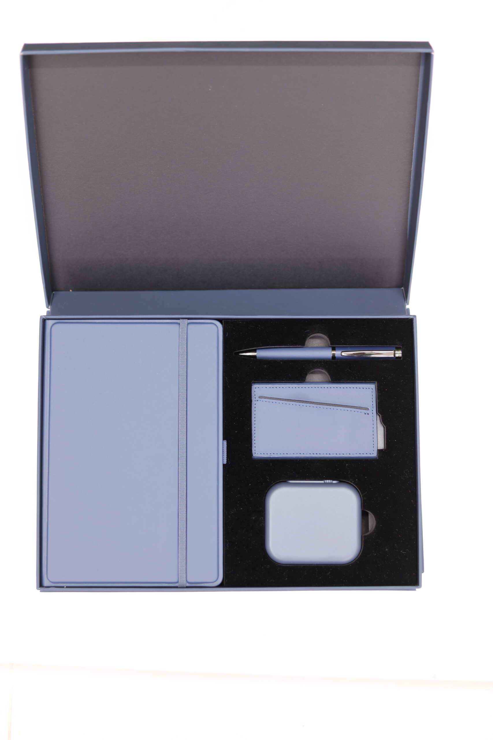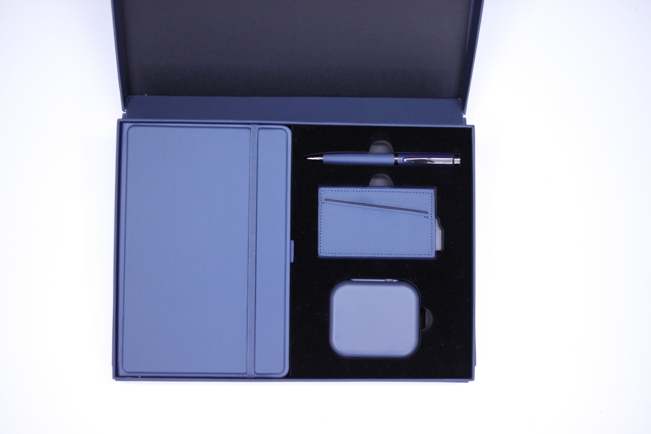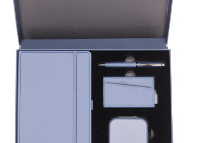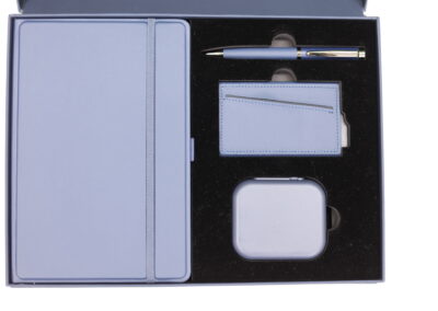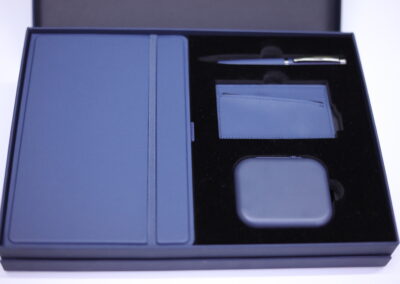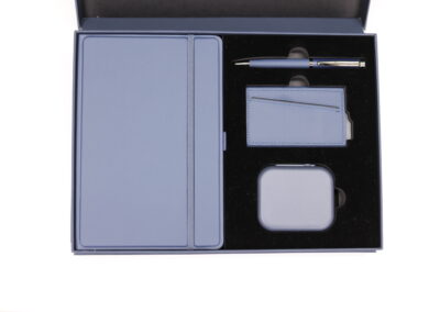Executive Set consisat of a 3D Pu Noteboook with elastic, 5000 mAh 3n1 unique magsafe powerbank, RFID magnetic card holder and metal pen all in blue color. Box Size: 30.5×22.5×4.5cm. Packaging: Paper Sleeves