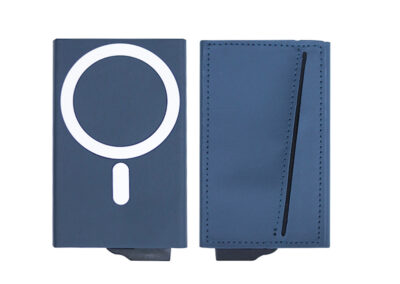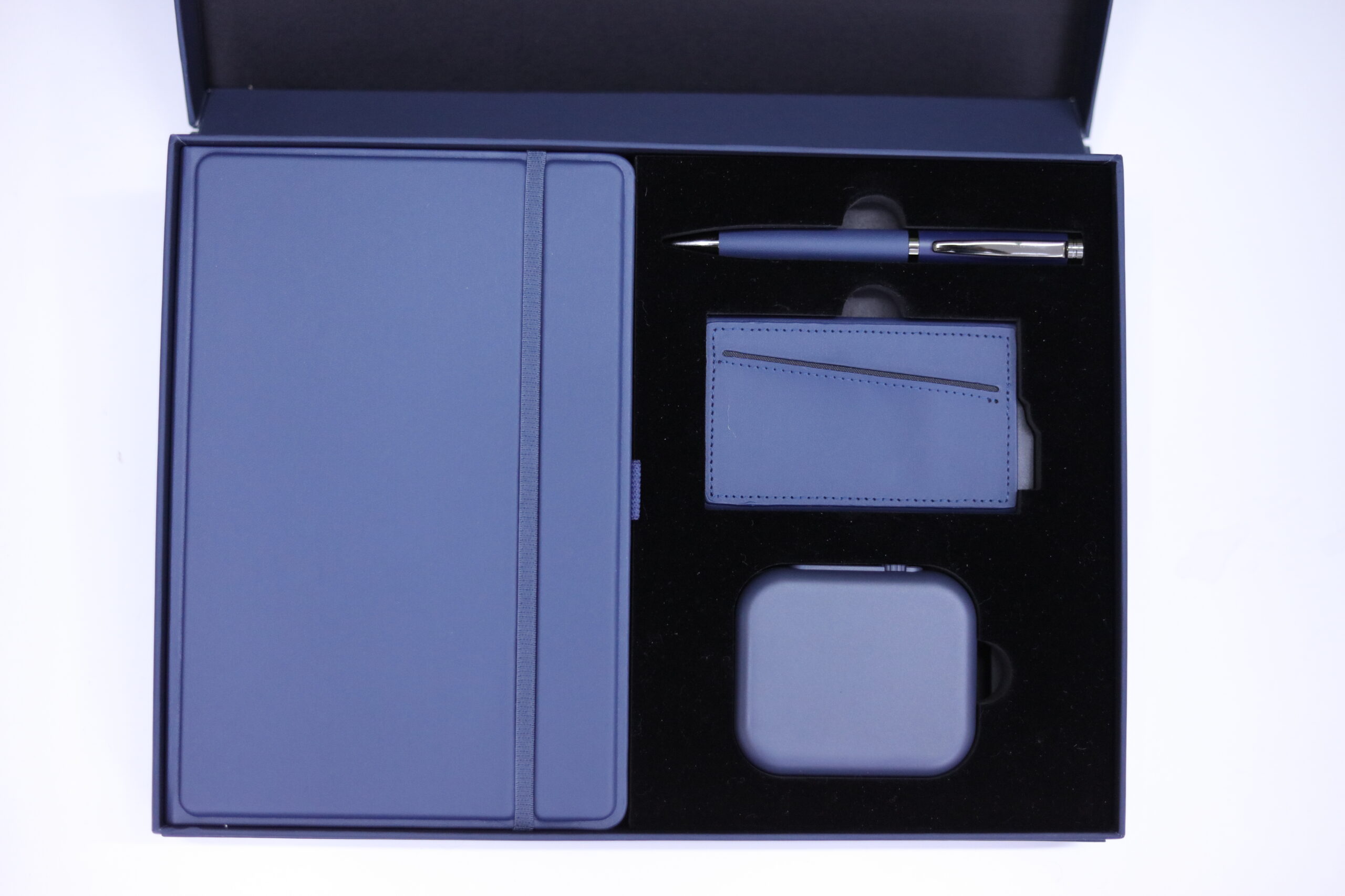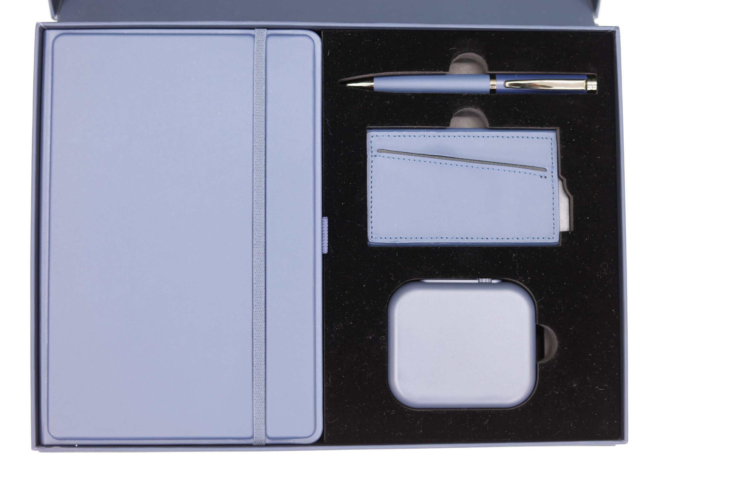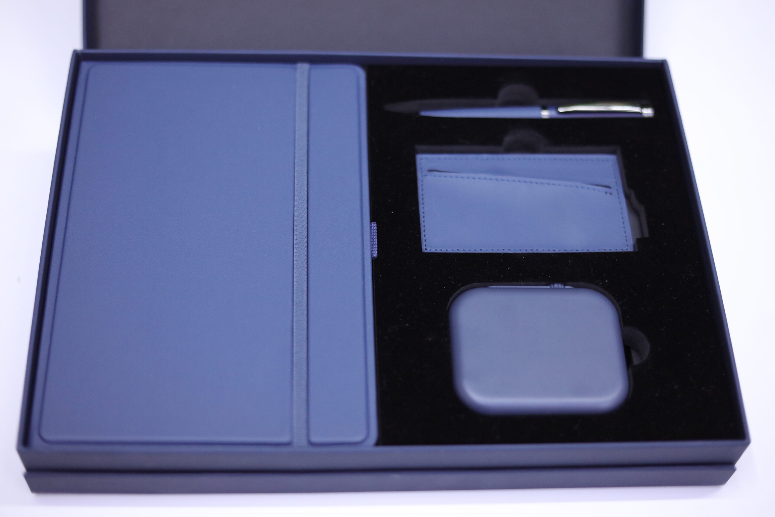 Executive Set consisat of a 3D Pu Noteboook with elastic, 5000 mAh 3n1 unique magsafe powerbank, RFID magnetic card holder and metal pen all in blue color. Box Size: 30.5×22.5×4.5cm. Packaging: Paper Sleeves