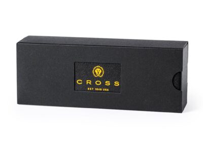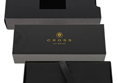 Elegant and functional, this Cross pen box packaging is designed to showcase and protect your premium writing instrument. Crafted with a sleek, sturdy exterior and a plush, velvety interior, it ensures your Cross pen remains safe while offering an upscale presentation perfect for gifting or display. The box comes in a black sleeve with a cut out opening in the middle to show the Cross logo.