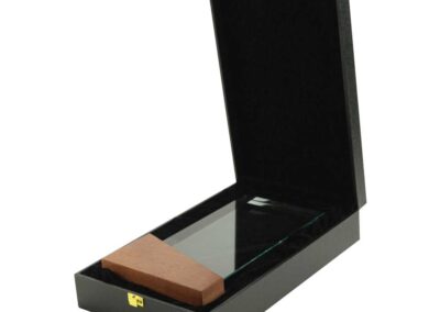 Material: Wood and Crystal | Item size: 140 x 40 x 240 mm | Weight: 1.190 kg, The distinguished and sophisticated acknowledgment items known as crystal awards with a wood base and presented in a black hardboard box radiate elegance and charm. These awards create a striking and unforgettable object that is perfect for recognizing remarkable accomplishments and achievements by fusing the brilliance of crystal with the everlasting charm of wood.