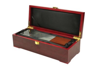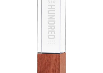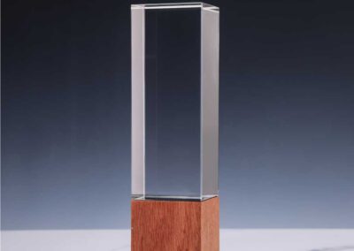 Cuboid-shaped crystal awards with wooden bases, and packed in a wooden presentation box.