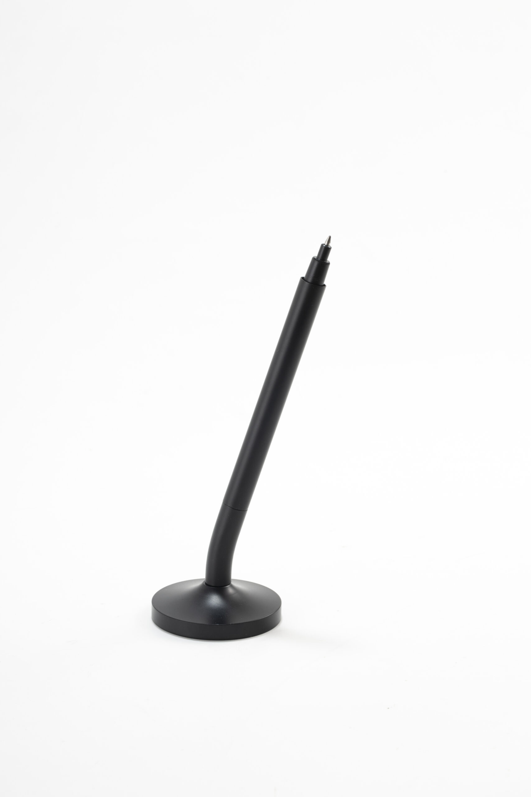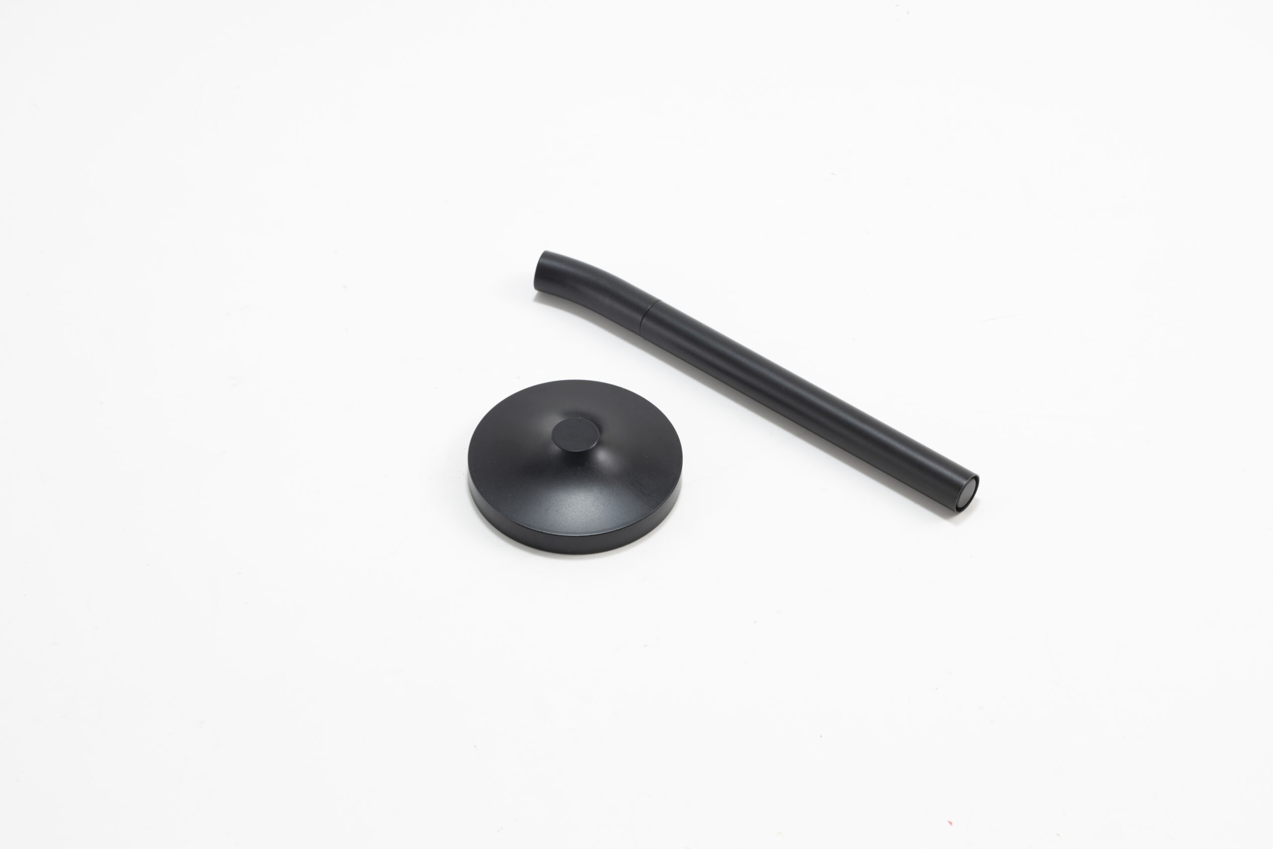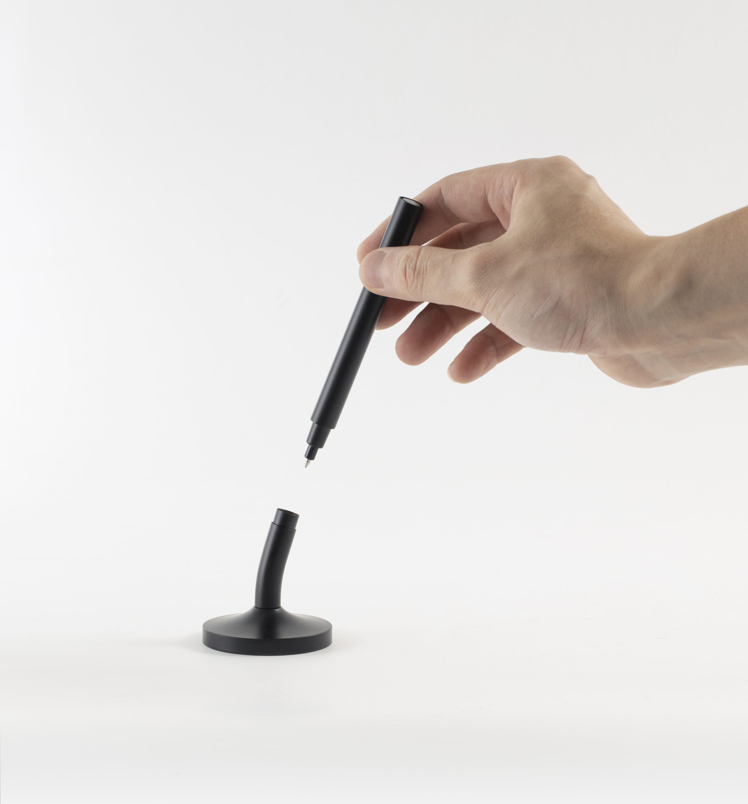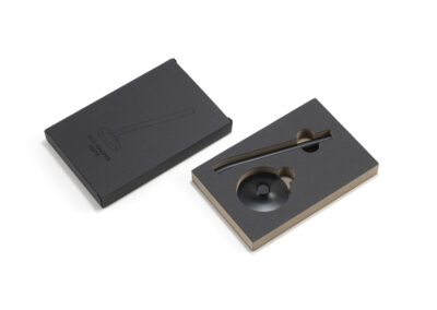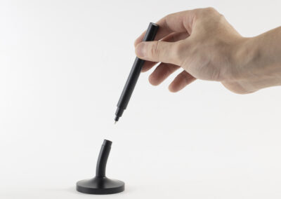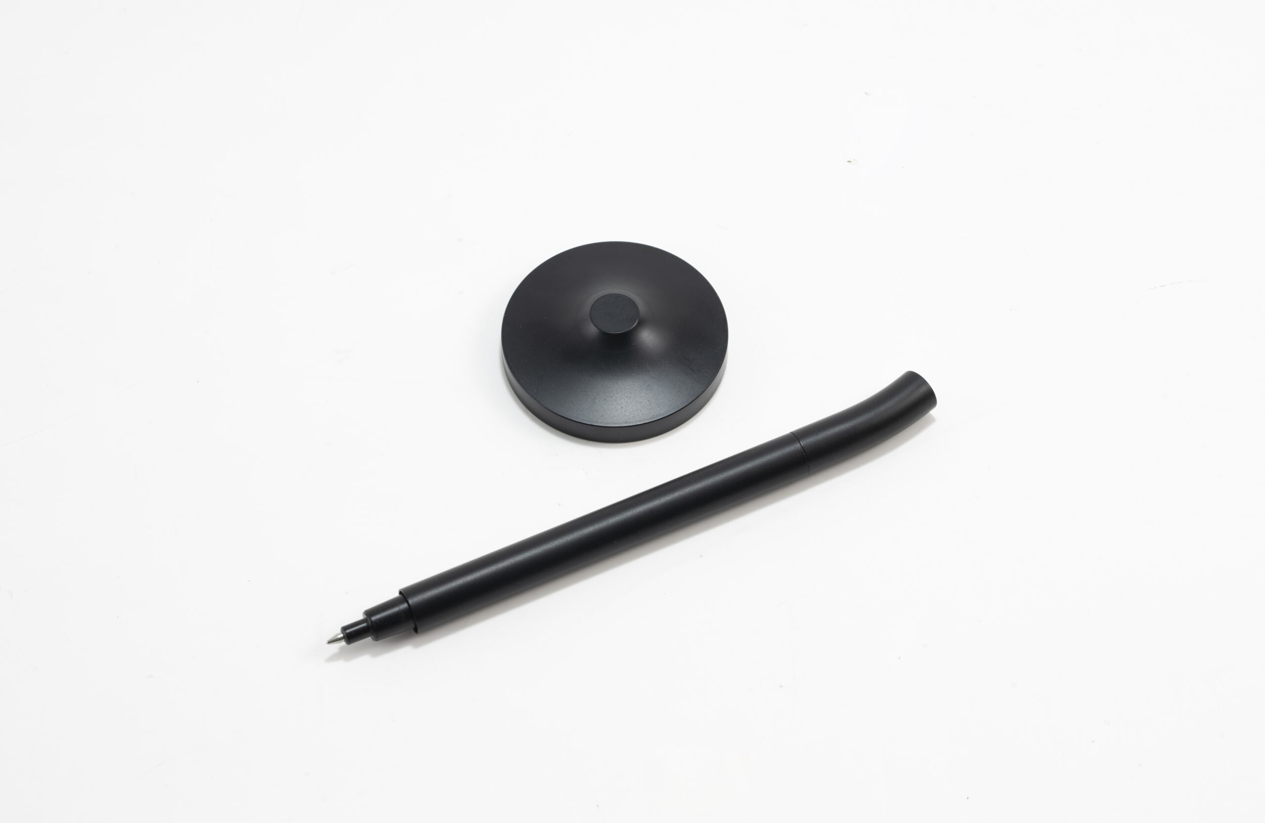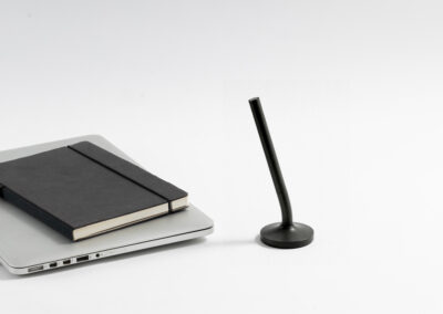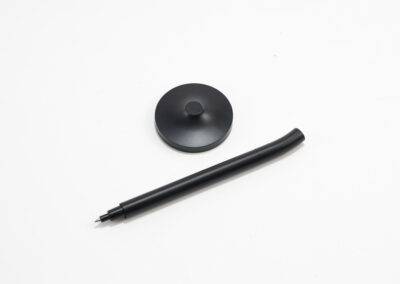 A sleek cap-off roller table pen with a 0.7mm blue ink refill. Features a matte black aluminum barrel and cap, brass tip and ring, and iron top and terminal for a refined, professional look. Comes with a matching matte black round stainless steel base. Set packed in PB31 box with white card lining. Base Size: 5.4X1.5 cm.Pen Size:13.6 X 1.1 cm. Packaging: Paper Box