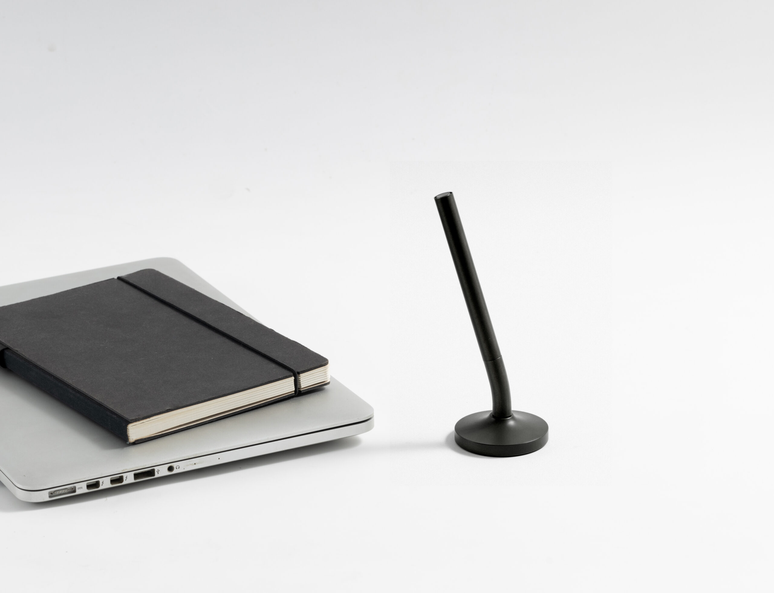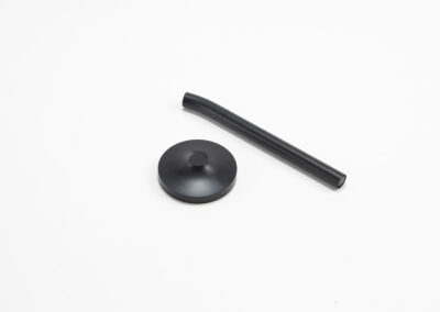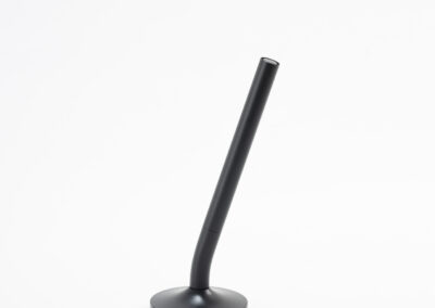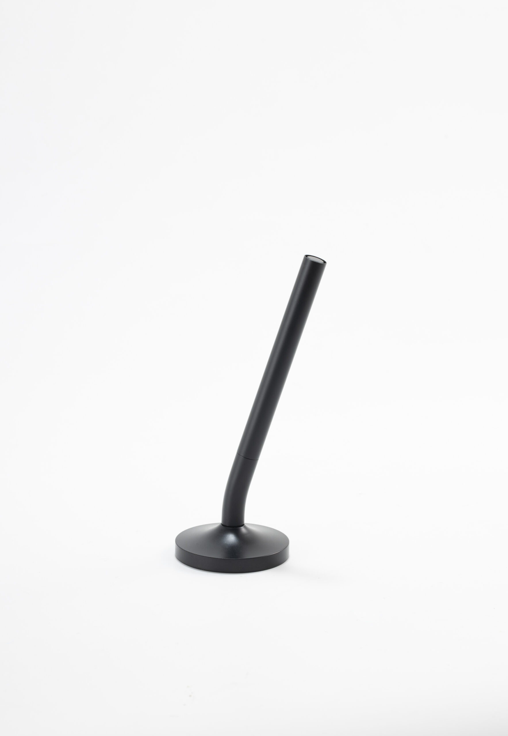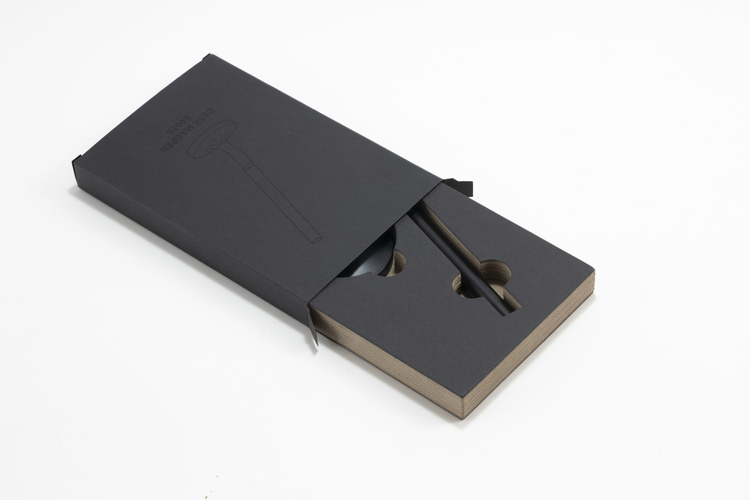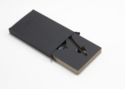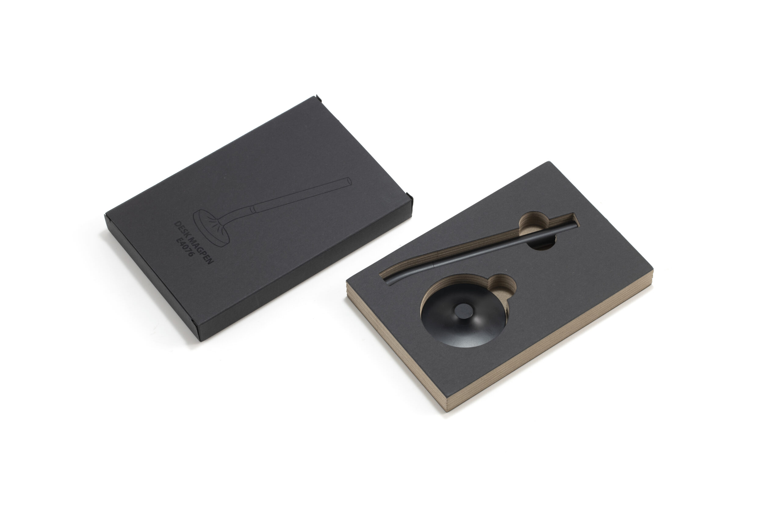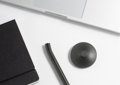 A sleek cap-off roller table pen with a 0.7mm blue ink refill. Features a matte black aluminum barrel and cap, brass tip and ring, and iron top and terminal for a refined, professional look. Comes with a matching matte black round stainless steel base. Set packed in PB31 box with white card lining. Base Size: 5.4X1.5 cm.Pen Size:13.6 X 1.1 cm. Packaging: Paper Box