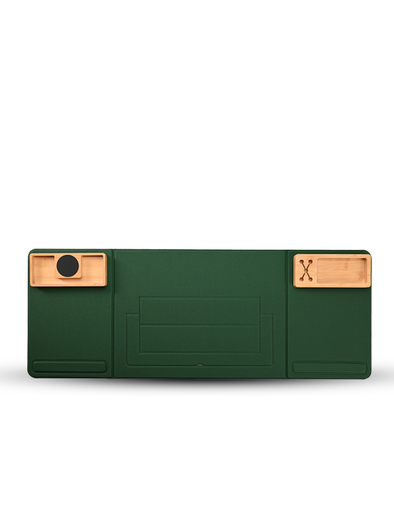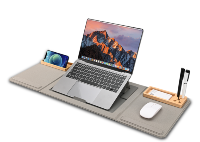 Foldable Desk Pad Organizer with laptop stand and two magnet bamboo organizers. One is pen & business card holder and the other one Has 15W wireless charger and light up piece. Material has no stitching – welding technology RCS PU Material. Has a part that can be used as mousepad with armrest which is very perfect for daily desktop activity. Product Size: 80×29.8×1.8cm (open) and 40×29.8×1.8cm (folded) Packaging: FSC Paper Box