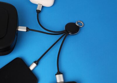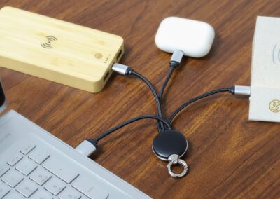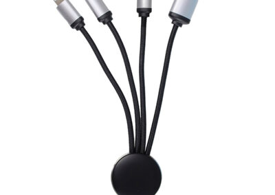4-in-1 charging cable with iPhone, micro USB, USB, type C charging port. Comes with white led light.