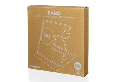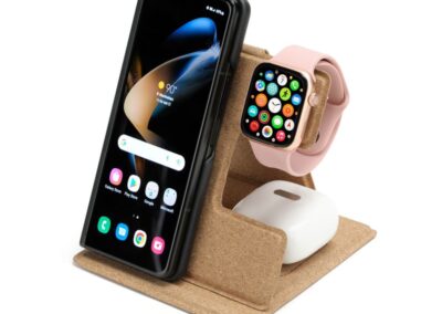 FARO is a 3-in-1 simultaneous charging station made with cork and featuring the latest 15W magnetic wireless charging for mobile phones, magnetic Apple Watch charger and wireless charging enabled earpods (up to 3W). All devices can simultaneously charge with a single Type C connection. Folds flat and easy to carry. Perfect gift for office and desk with a prominent branding area.