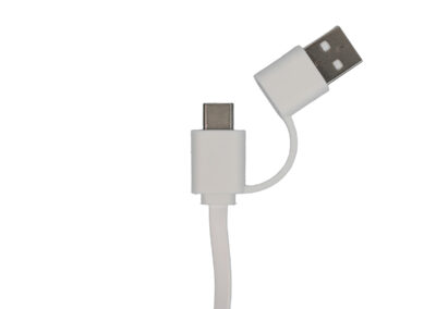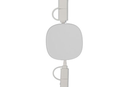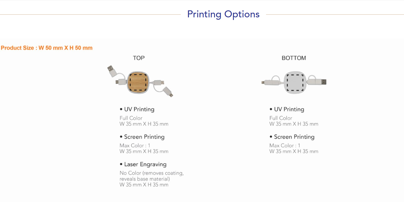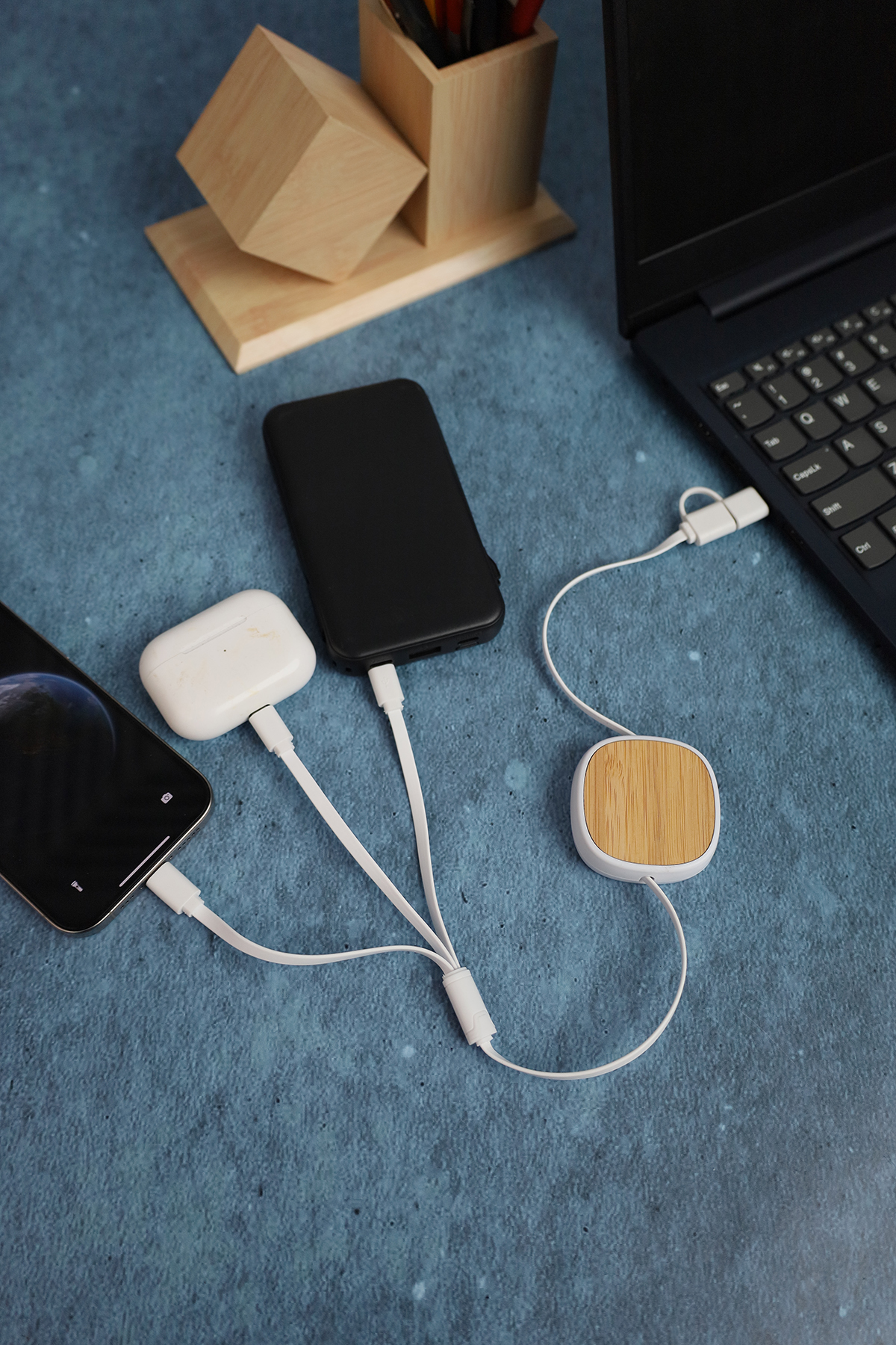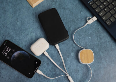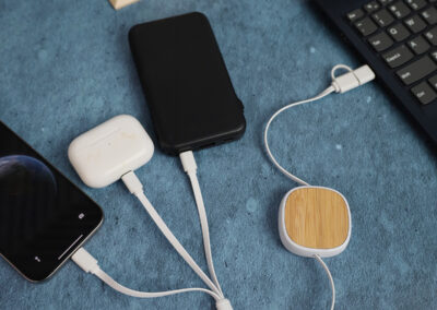4 in 1 charging cable quipped with fast charging made from bamboo, ABS & metal. Comes with USB+Type-C input port & Type-C + micro USB + lightning & android 2-in-1 port.