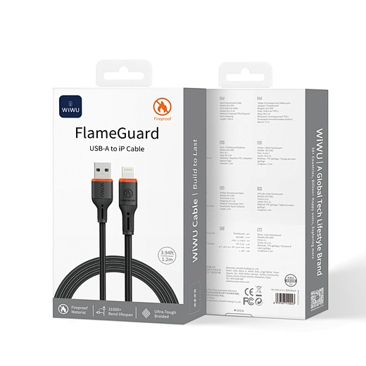 Charge with complete confidence. The WiWU FlameGuard Cable is meticulously engineered to solve the hidden dangers of traditional charging cables, such as ignition and overheating. Its core and braiding are crafted from advanced flame-retardant materials; even when exposed to high temperatures, it will not ignite and will self-extinguish upon leaving the flame source. Beyond its superior safety, the FlameGuard is built to last. The high-density nylon braid is incredibly durable and resistant to fraying, while remaining soft and flexible for easy handling and storage. It’s the ultimate combination of safety, durability, and everyday convenience.