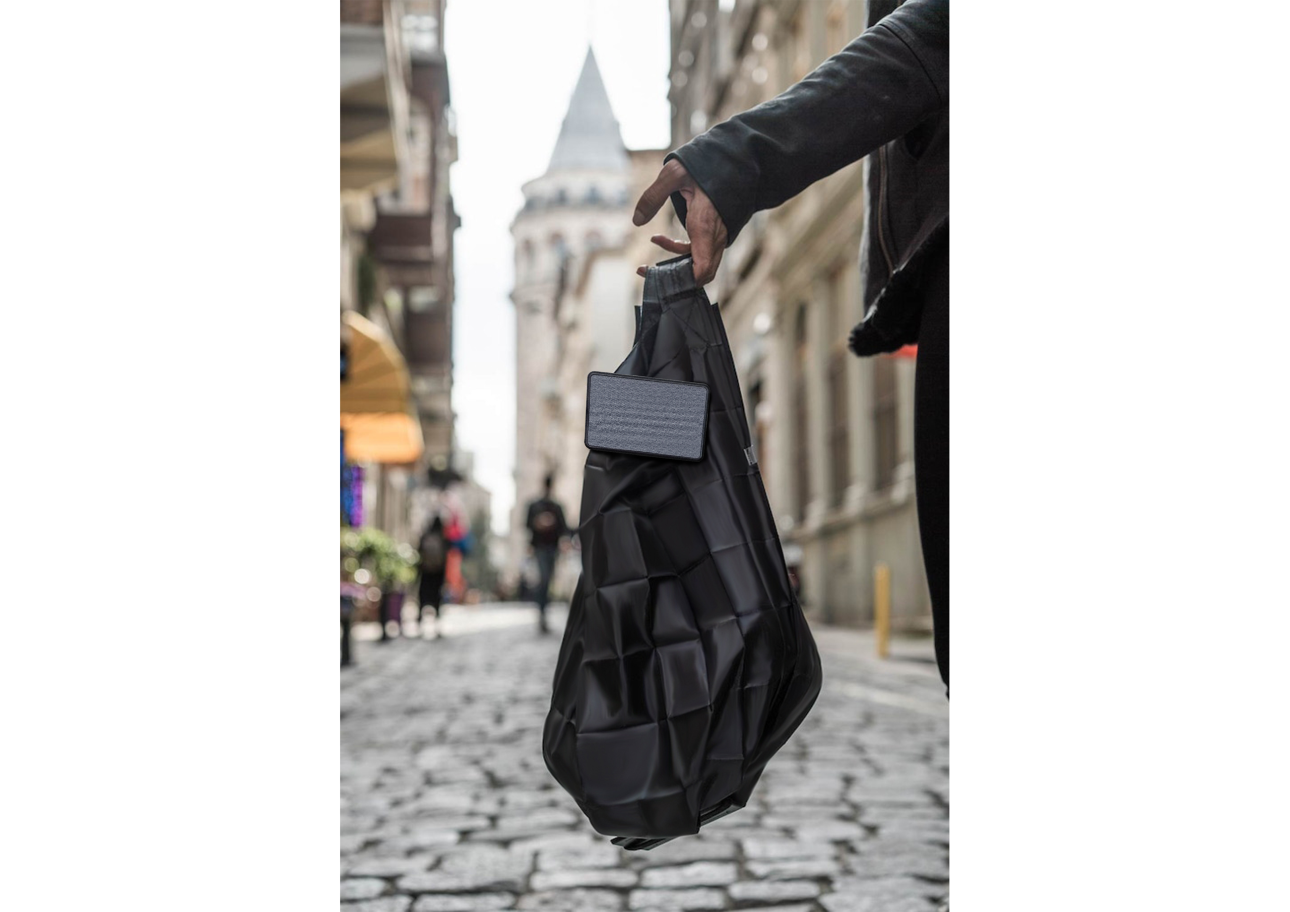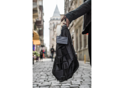 Foldable reusable bag in RPET material. Bag Size: 46x39cm (max open). Foldable Size: 10×6.5×1.5cm. Packaging: Polybag