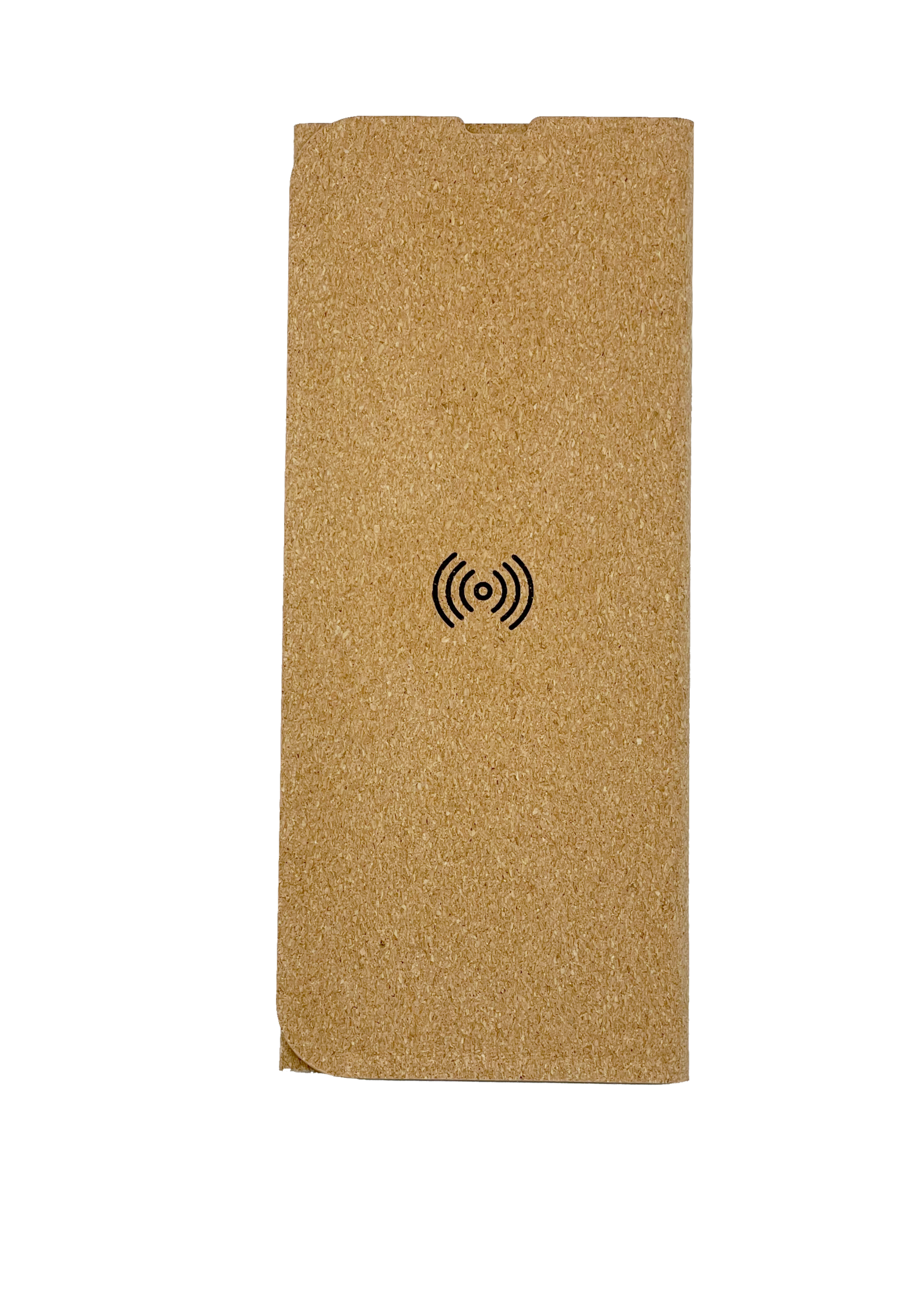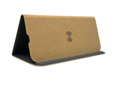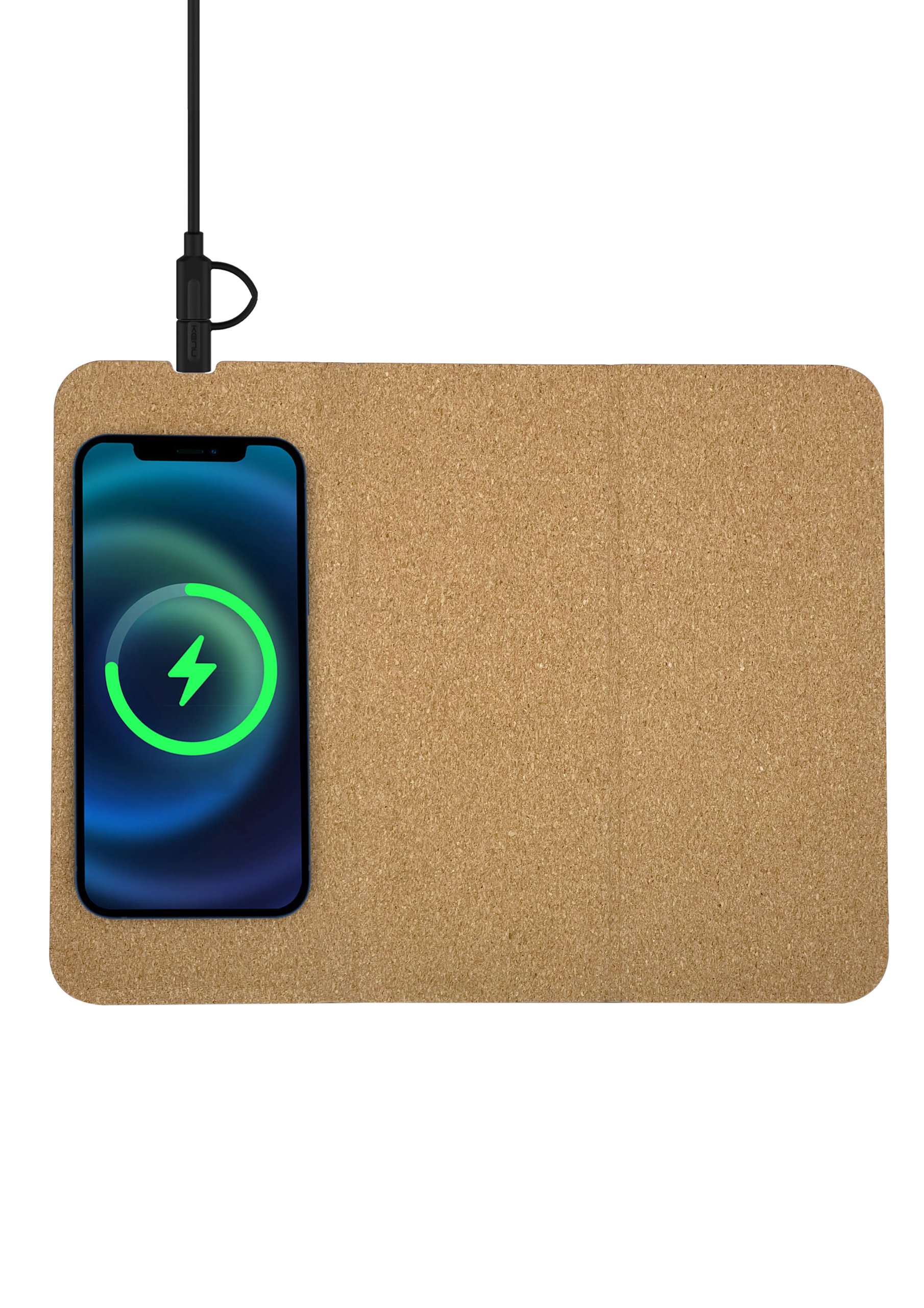 Foldable Mouse pad in cork material with 10W Wireless charger. Can be folded as mobile stand. Product Size: 20.2 x 8.5x 0.9cm (Folded); 26.4 cm (L when opened). Packaging: Black Paper Box