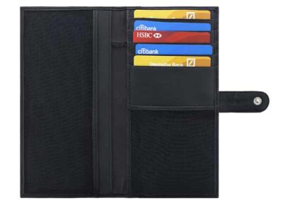 Elegant multi pocket genuine leather cheque book holder with button closure. Consists of 5 credit card slots and an ID pocket. Carry all your important documents such as cheque book, cards and other travel document conveniently with this thoughtfully designed wallet.