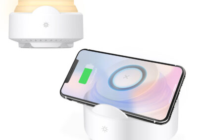 This wireless charger has an innovative design as the body is completely stretchable and collapsible and the material used allows it to be placed in many different viewing angles so you can use your phone or view media comfortably while charging. It also has a bluetooth speaker built in and a night light making it the perfect desktop accessory!