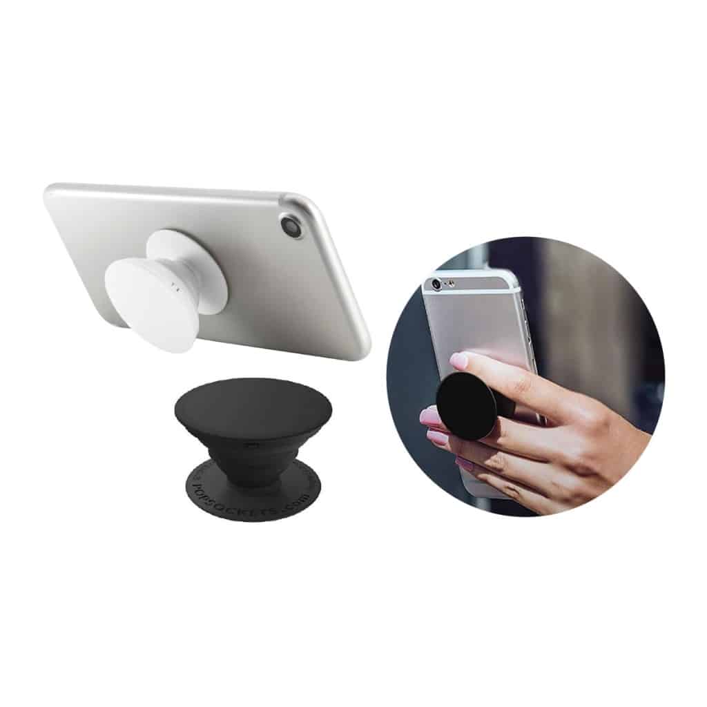 Reusable adhesive, repositionable, collapsible grip & stand sticks to most devices & cases.