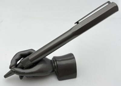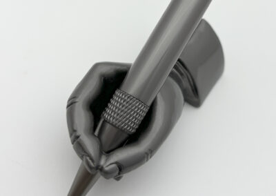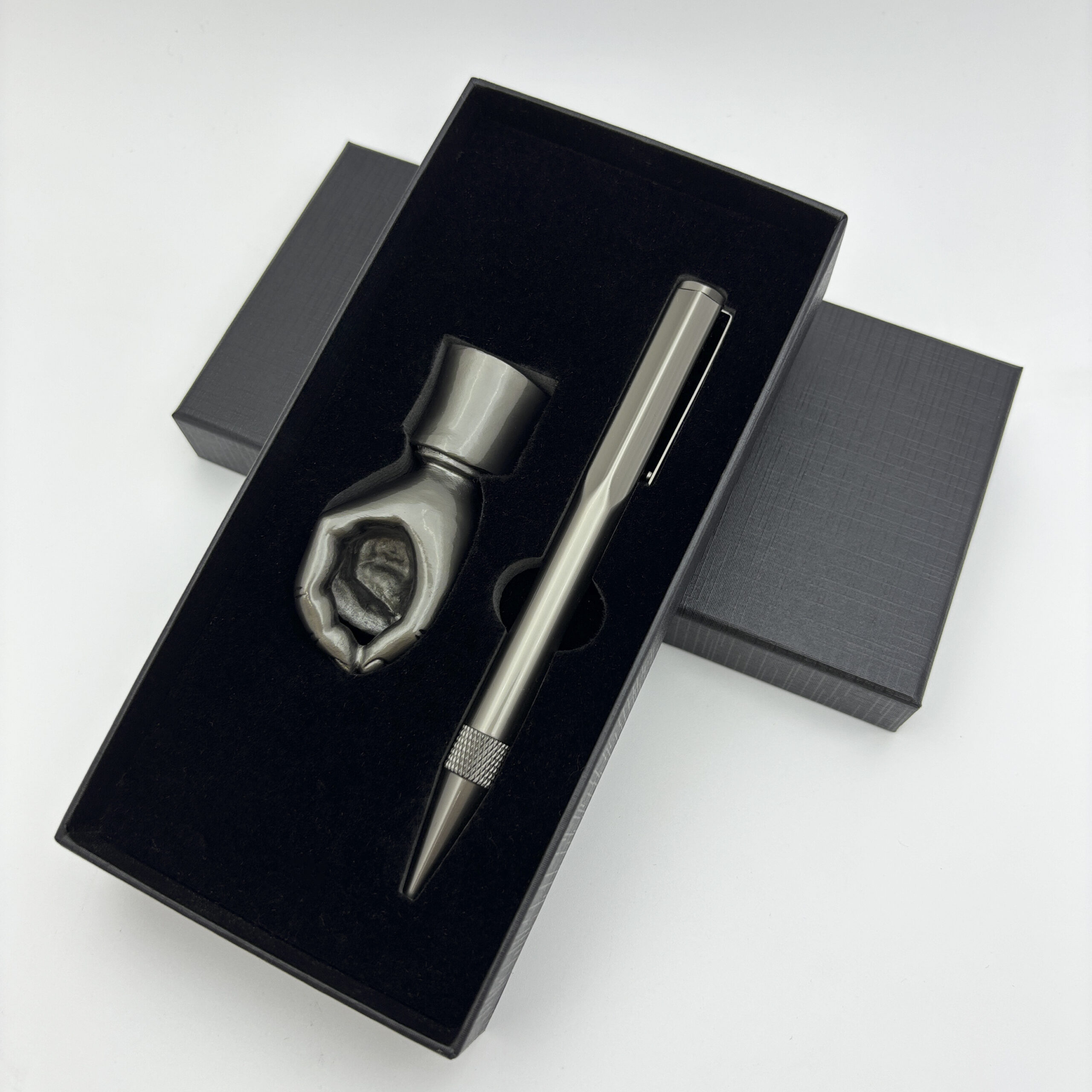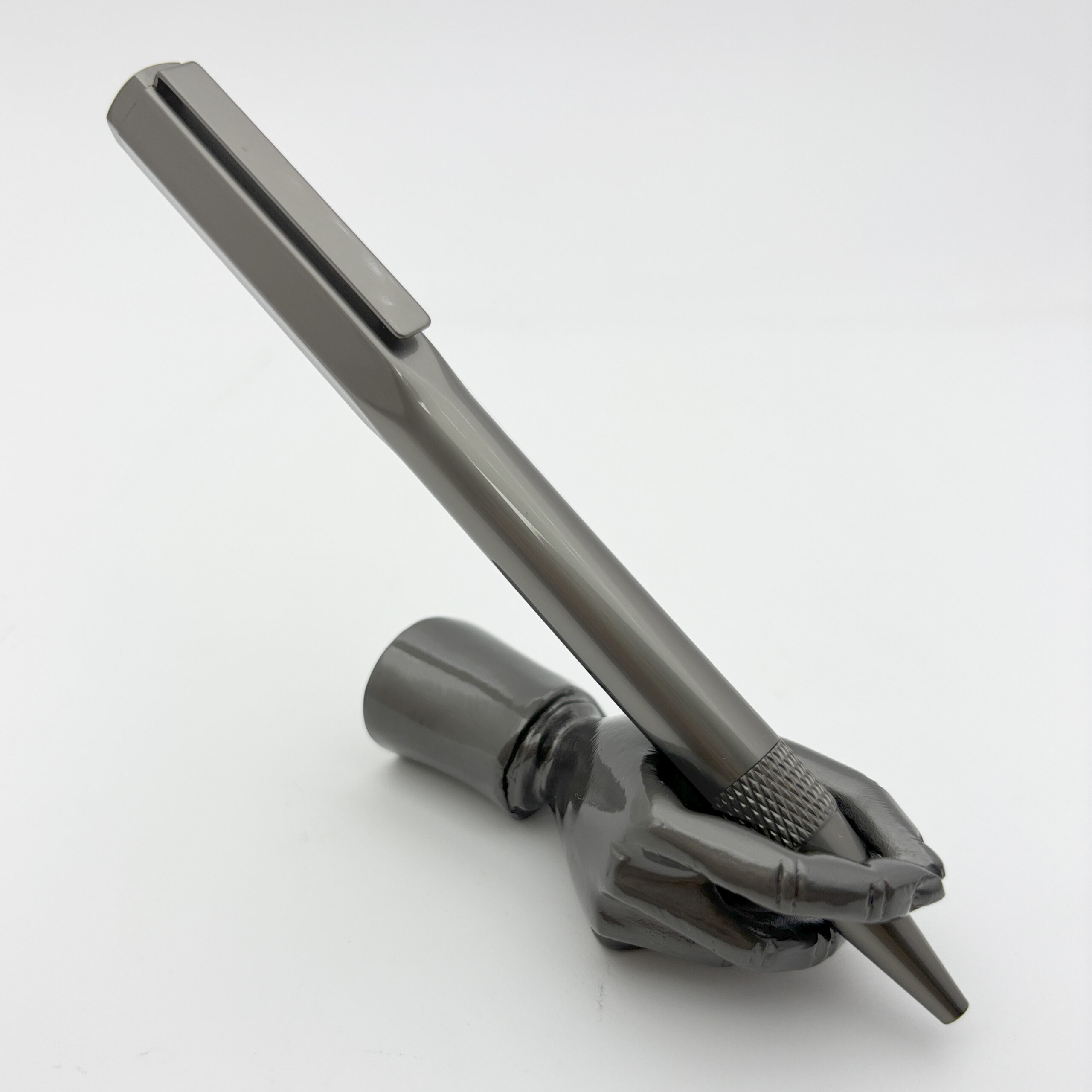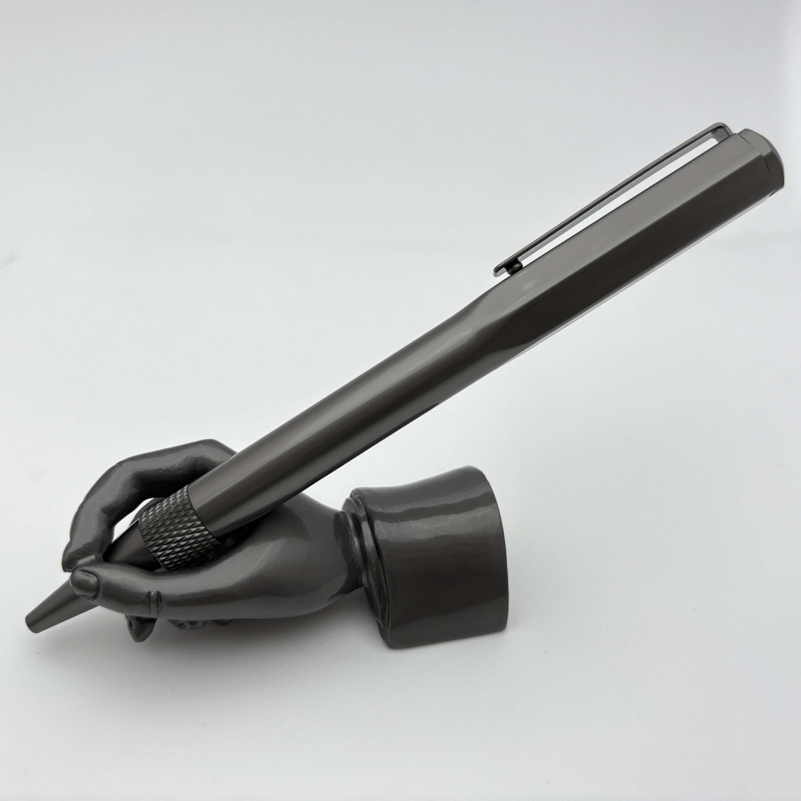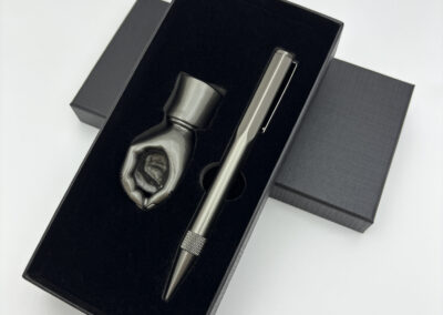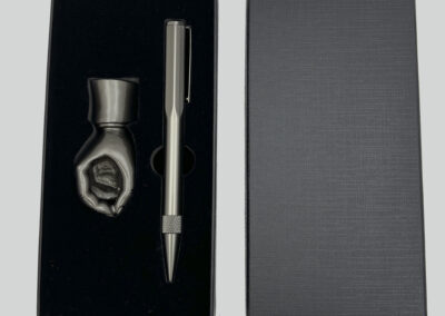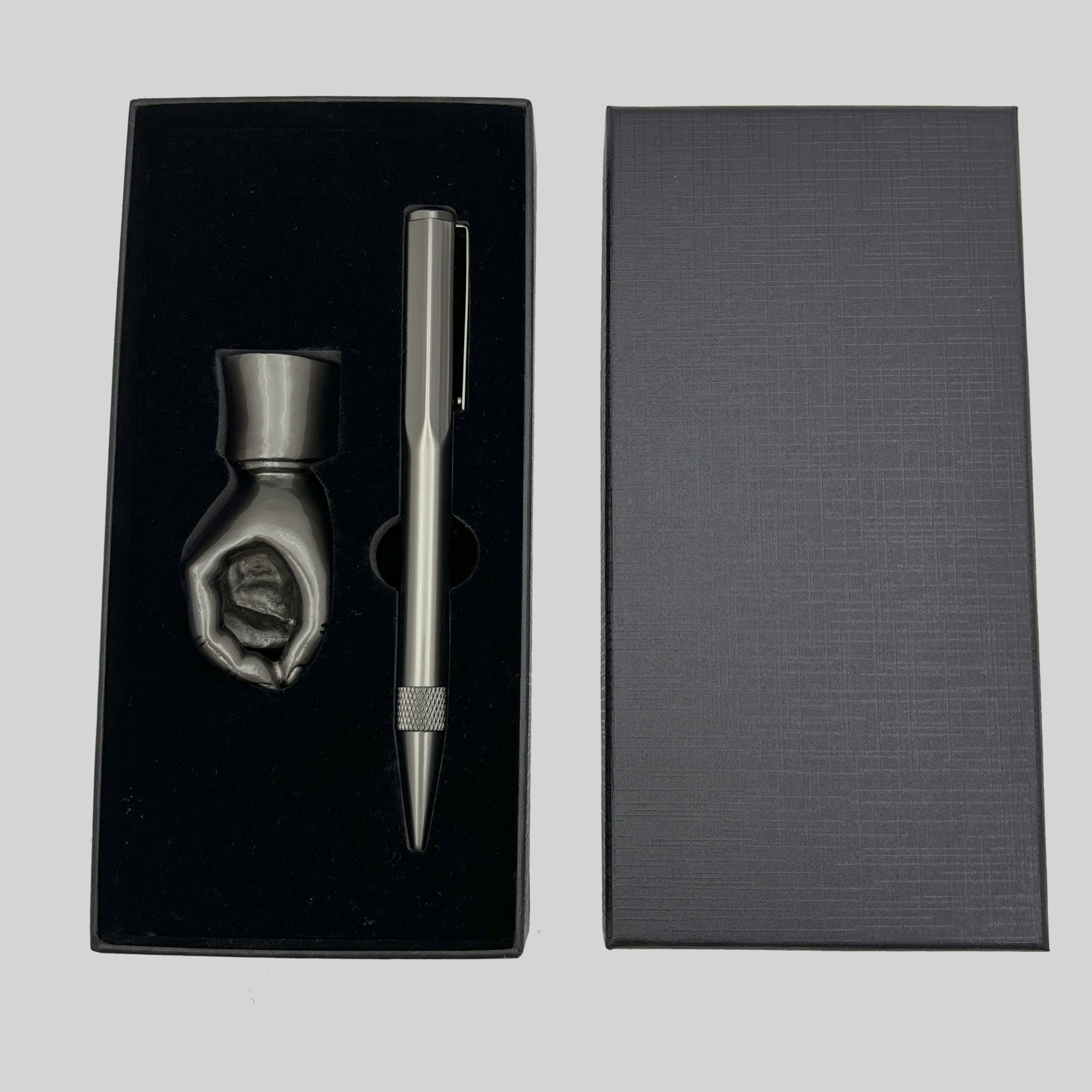 Luxury VIP Pen set in electroplated hexagonal brass ballpoint twist pen and zinc alloy hand shape pen holder paper weight. Handy Pen that gives more class to your table as it looks elegant on the top of it. Product Size: 18x9x3.5cm. Packaging: Hard paper box