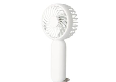 Portable electric hand fan with desk stand/carabiner for travel. 3 speed settings to help you beat the heat. Inbuilt rechargeable battery with USB port. Works up to 4 hours on single charge