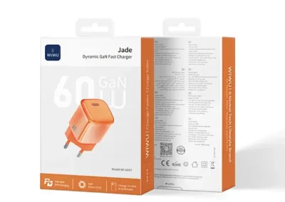 Experience the new benchmark in speed and portability with the WiWU Jade 60W GaN Charger. Engineered specifically for the Apple ecosystem, it features the advanced AVS dynamic protocol, delivering a lightning-fast charge that powers your iPhone to 50% in just 20 minutes. At its core is a high-performance Gallium Nitride (GaN) chip that enables a smaller, lighter, and more efficient design without compromising on power or safety. Its beautifully compact, jelly-like aesthetic is complemented by foldable pins (CN version), making it the perfect, space-saving travel companion. With multiple safety protections and full protocol compatibility, it’s the only charger you need for your Apple devices.