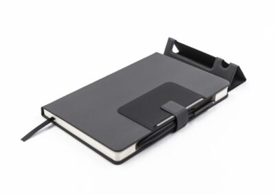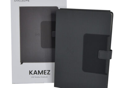 KAMEZ is a 15W wireless charging A5 notebook organizer with in-built folding mini-workstation – truly an avant-garde modern office notebook. Includes an integrated business card holder, magnetic clasp with integrated pen loop. Contains 192 pages and a folding phone and pen stand. Opens flat due to excellent binding quality