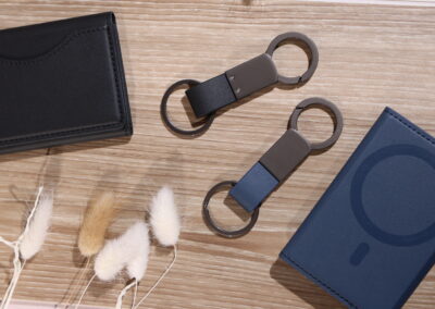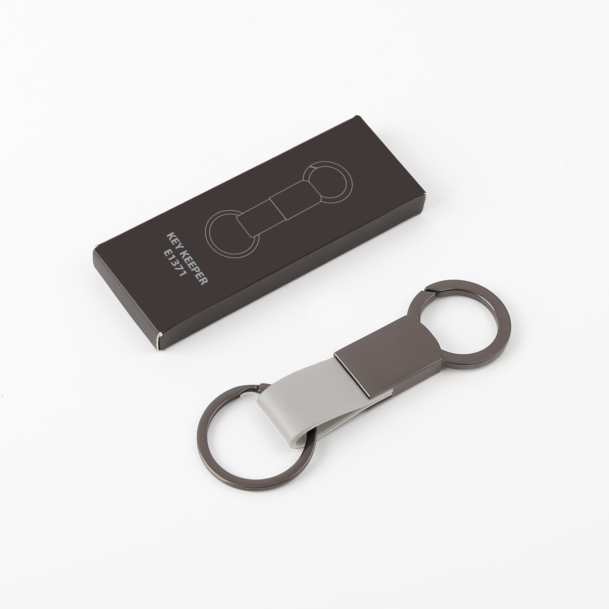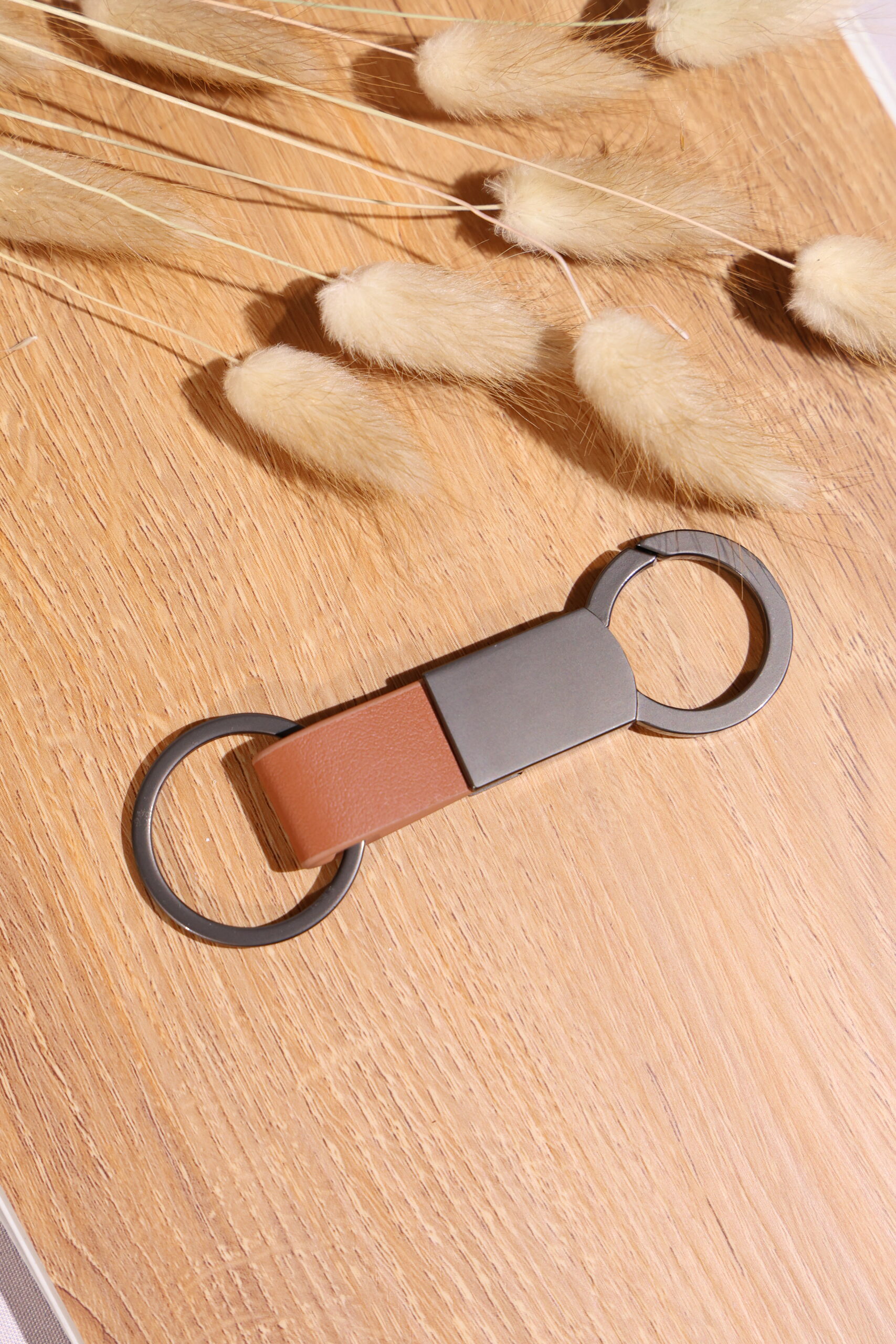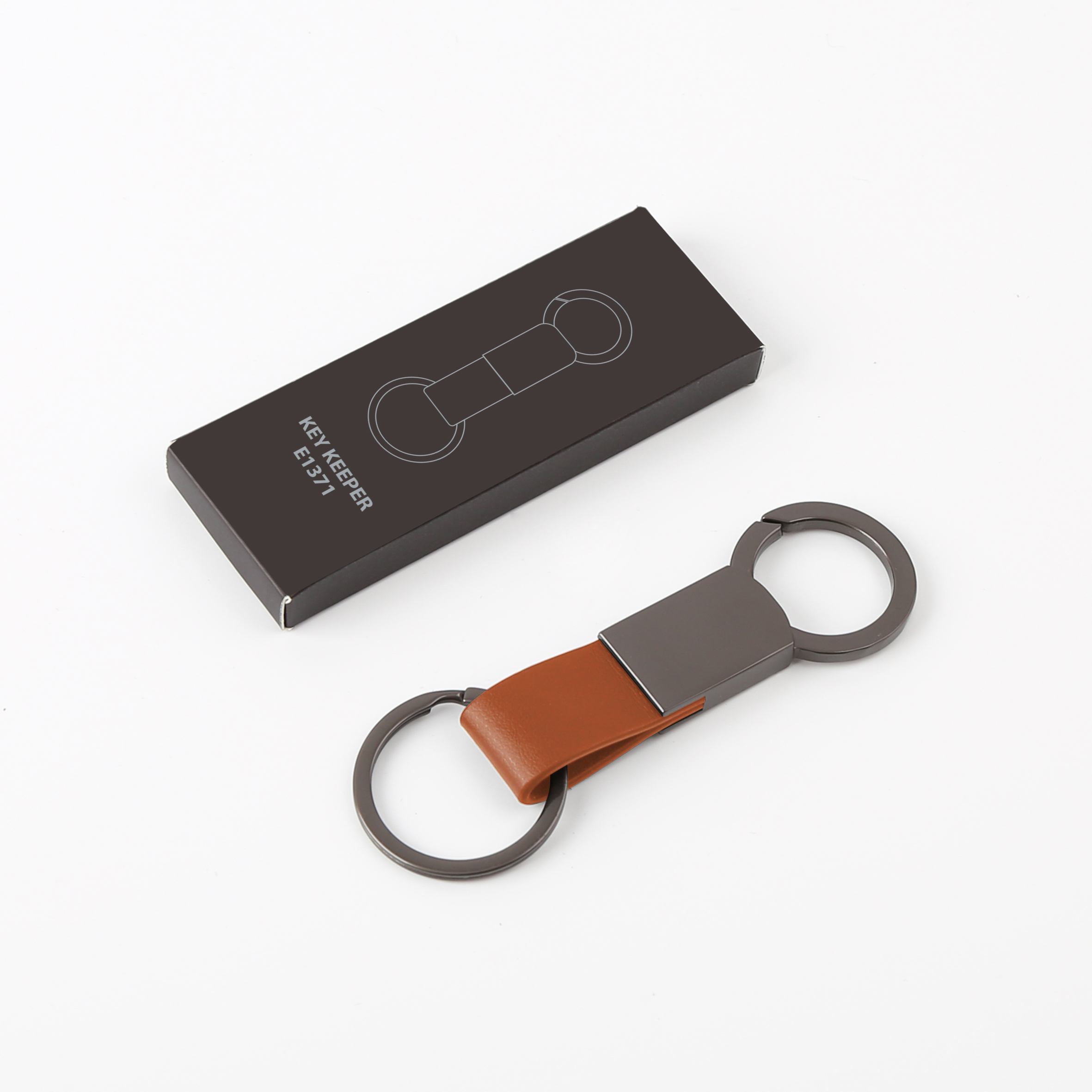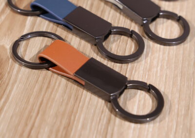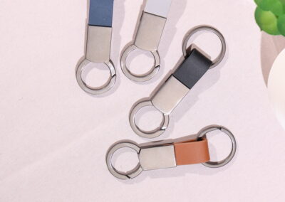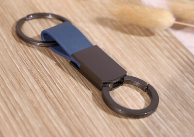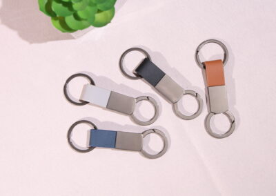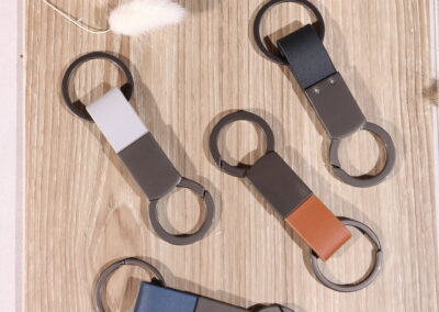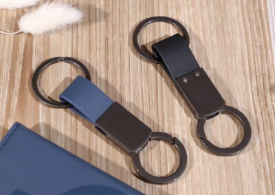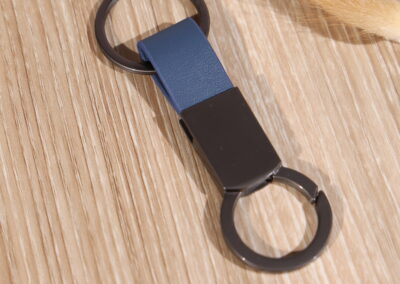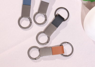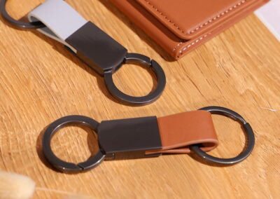 Elegant keychain made from PU leather and metal, combining durability with a sleek design. Product Size: 8.8×3.2cm. Packaging: PE bag