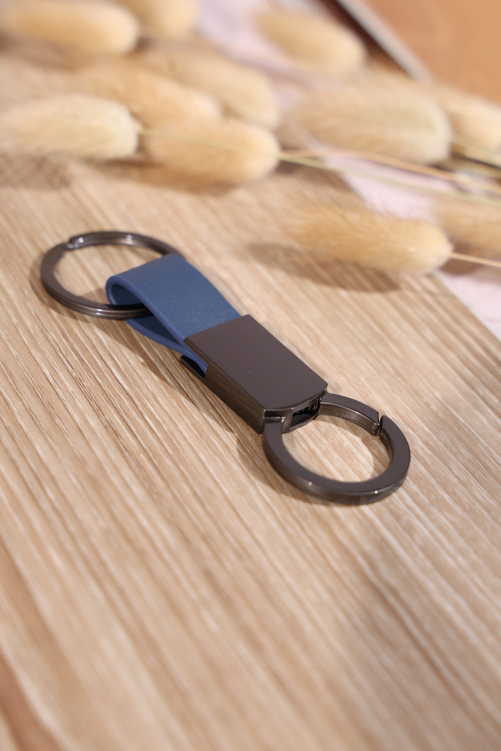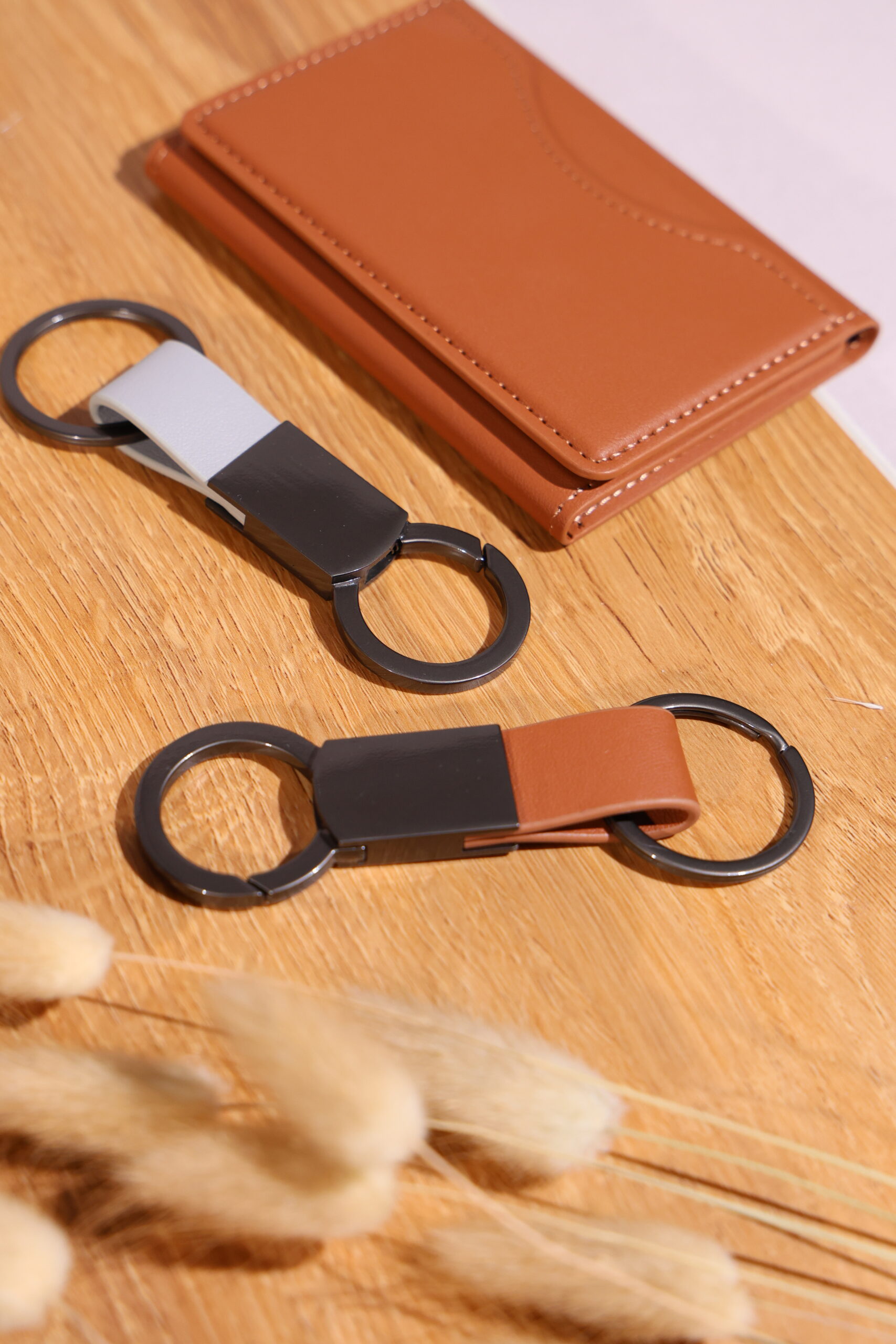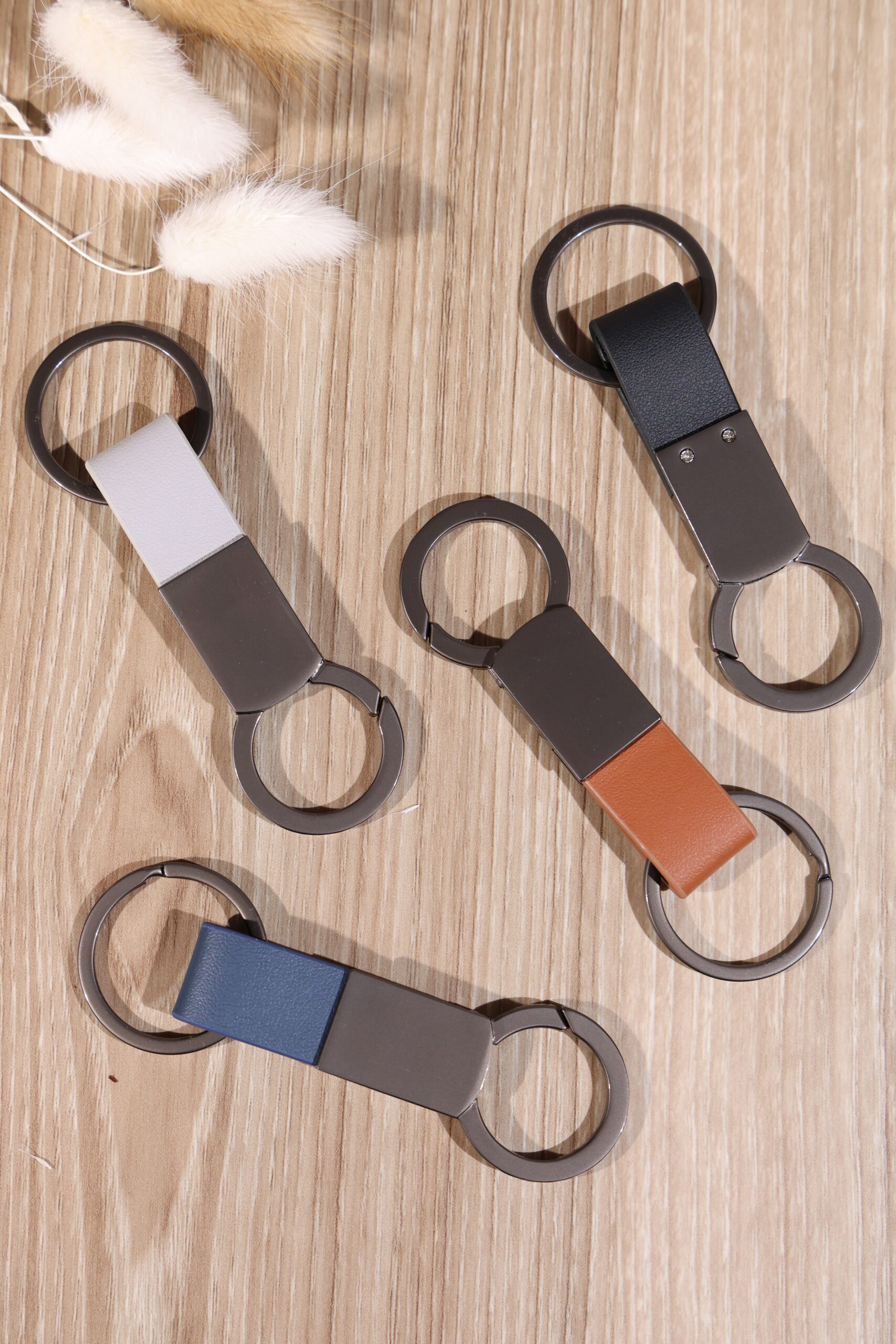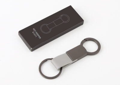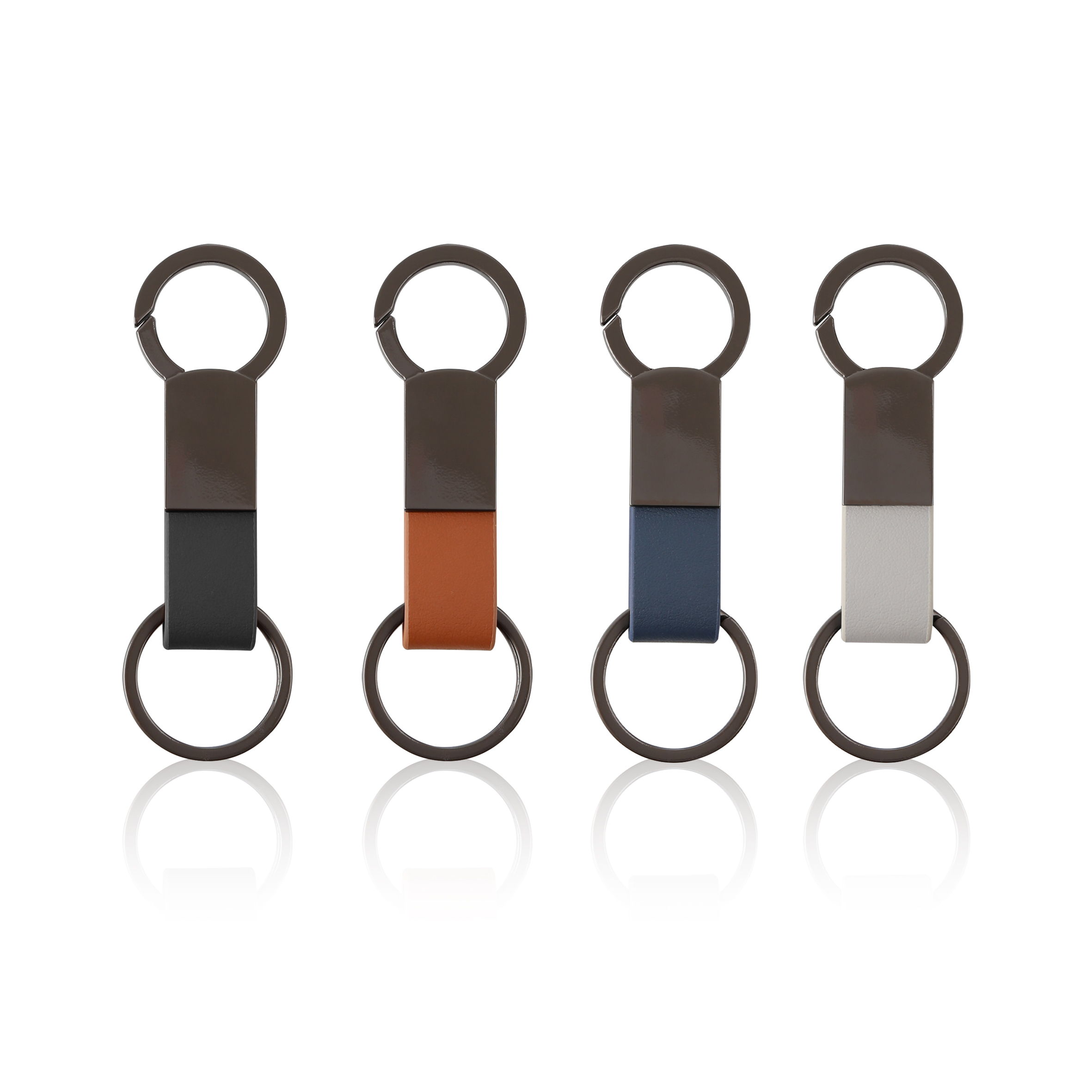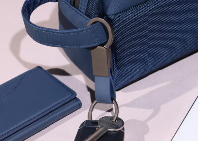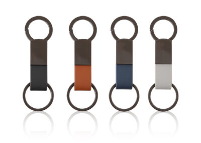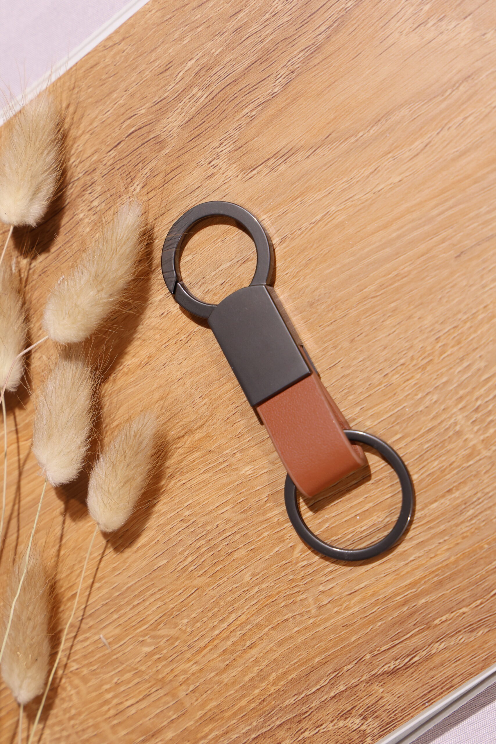 Elegant keychain made from PU leather and metal, combining durability with a sleek design. Product Size: 8.8×3.2cm. Packaging: PE bag