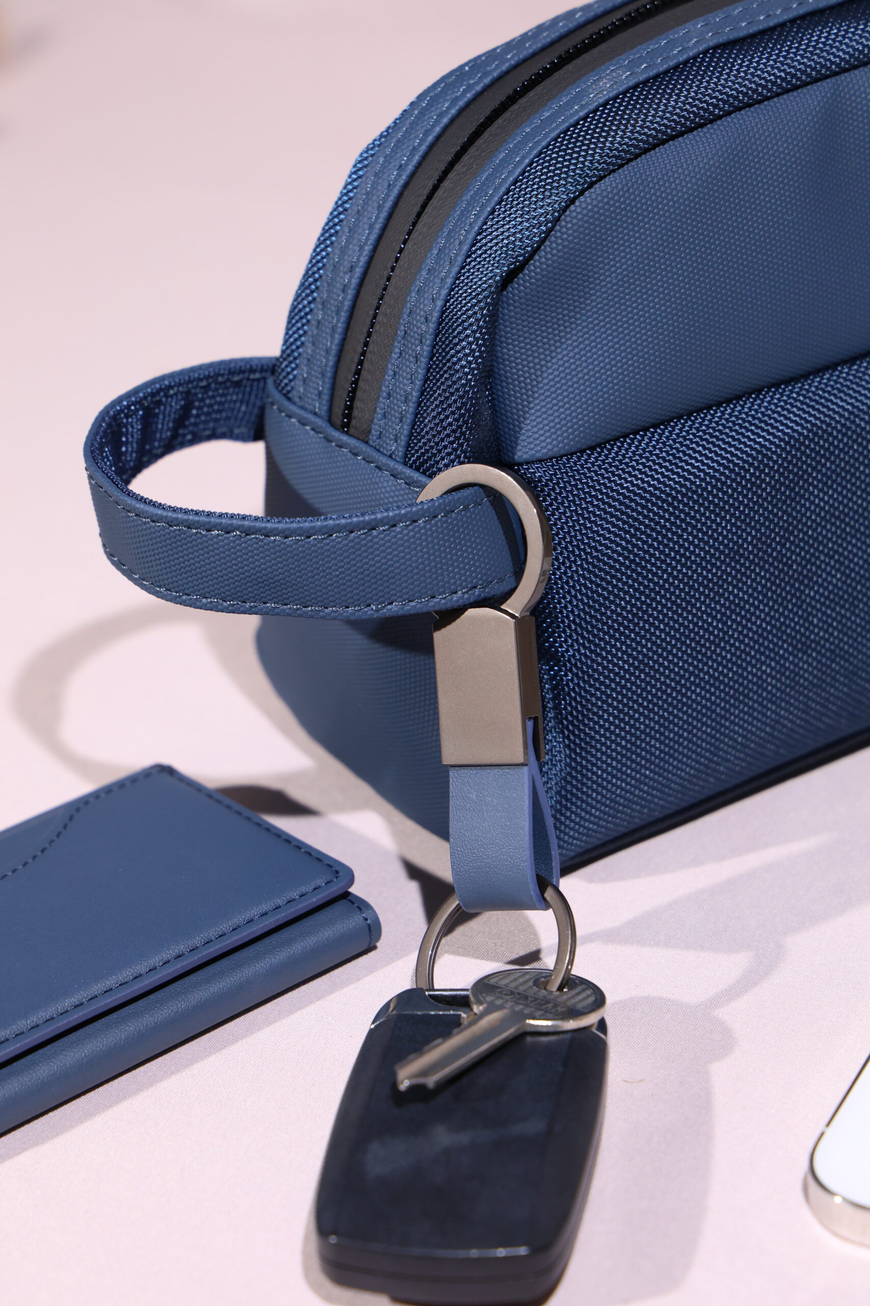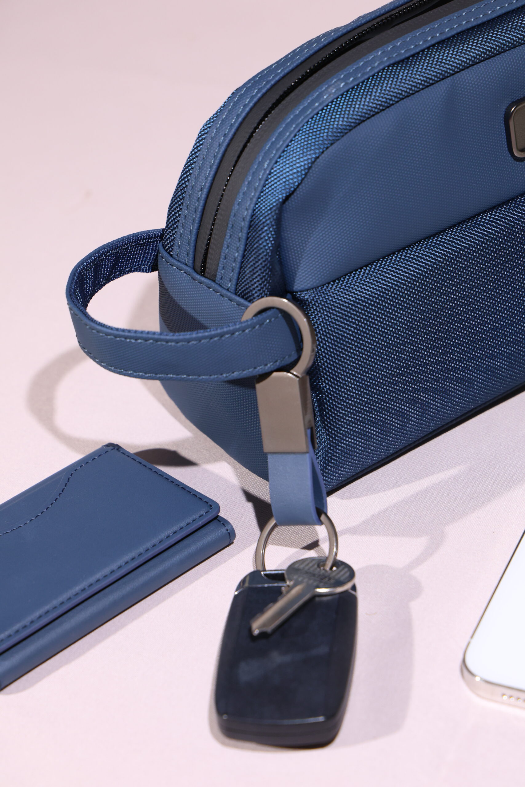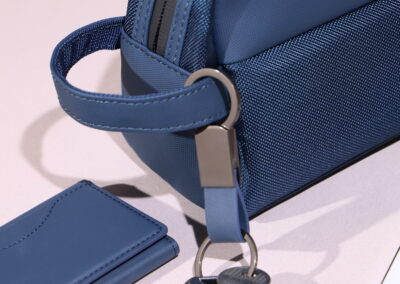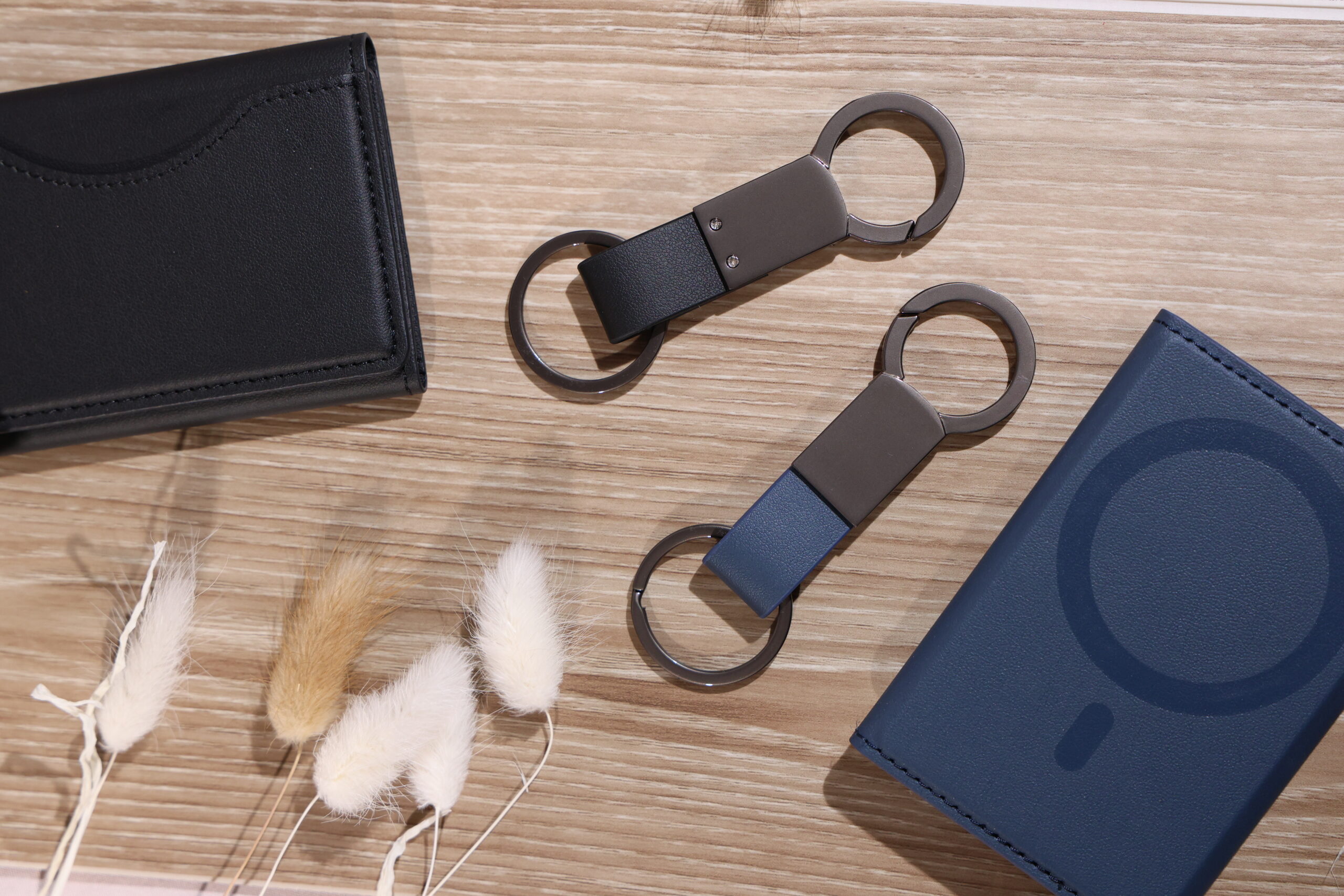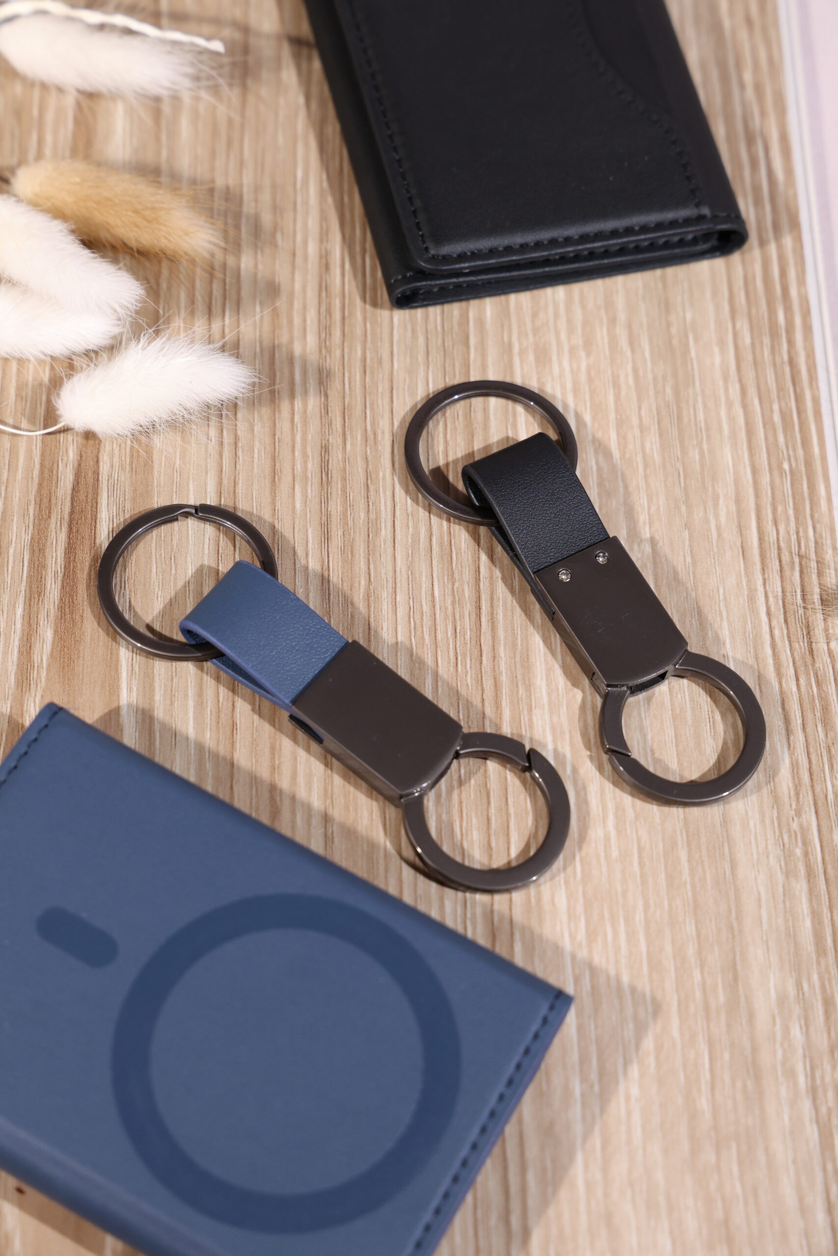 Elegant keychain made from PU leather and metal, combining durability with a sleek design. Product Size: 8.8×3.2cm. Packaging: PE bag