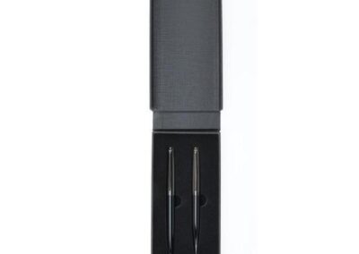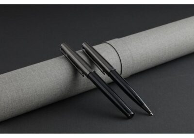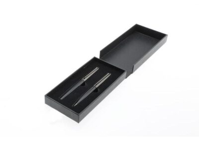 KIRAZ is a luxury gift set containing 2 Santhome® pens in chrome / black color. Features 1 rollerball and 1 ballpoint pen with soft spring mechanism and lacquered finish with premium texturing. Packed in a gift set box.