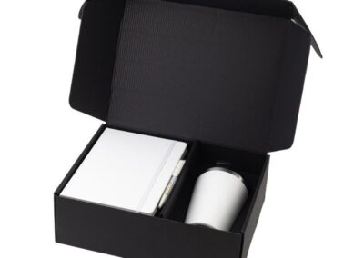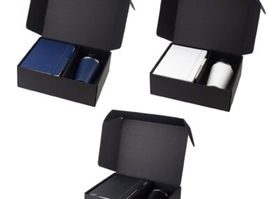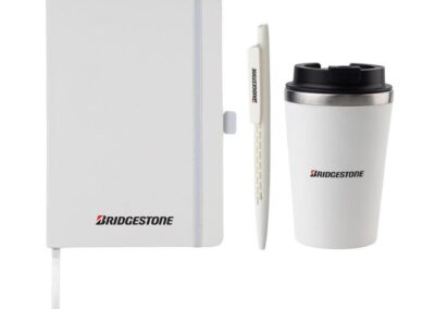 Gift set containing a double walled leakproof tumbler (350ml), A5 soft touch hardcover notebook and hexagonal barrel ballpoint pen – all 3 items are color matched in the gift set. Great value gift set from Giftology. Packed in a cardboard paper gift box.