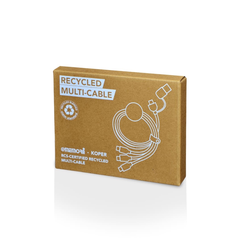 Koper is a RCS-certified recycled 6-in-1 charging cable that is made of 51% recycled PU and recycled TPE. Cable extends up to 120CM in length. It has a USB-A and Type-C input and 2-in-1 (micro-USB and lightning), Type-C, and micro-USB output. Packed in a recycled kraft gift box.