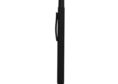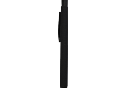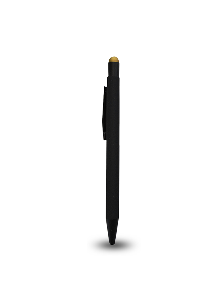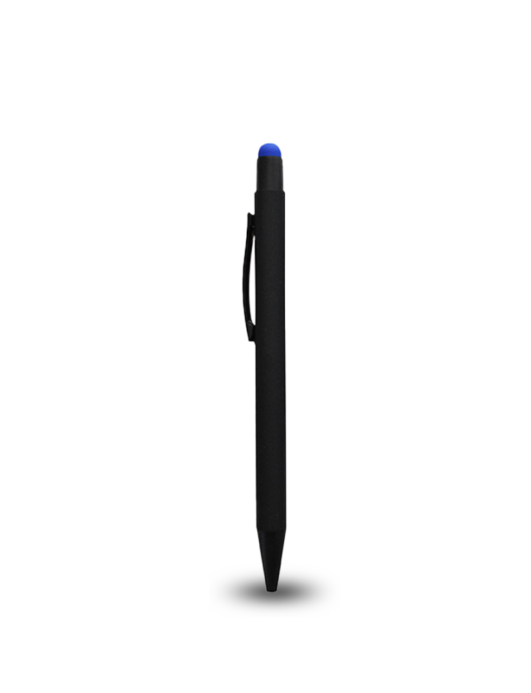 Aluminum material push pen with a body made from black rubber coating. It has a colored Touch Stylus and with colored mirror engraving effect. Blue ink. Product Size:14.1cm length Packaging: Polybag